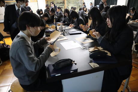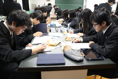 令和7年12月13日(土)、大阪教育大学教育学部の葛城元講師をお招きし、折り紙を用いた課題解決型授業を実施していただきました。対象は文理総合科1年生で、大阪教育大学の学生や大学院生8名にサポートしていただきながらの取り組みとなりました。