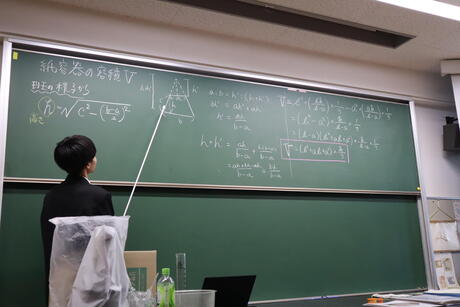 本授業の課題は、与えられた条件から折り紙容器の容積の最大値を求め、実際にその容器を作成するというものでした。折り紙容器は、今では一部のレストランのテイクアウト用の容器として採用されたり、被災地での炊き出し用の容器として利用されたりと注目されています。そんな折り紙容器をより効率的に活用するにはどうすれば良いかという現実事象と関りが非常に強い課題に取り組みました。扱う数値が複雑で計算が面倒であることから、数式を一般化することで答えまでの導出過程を簡略化することや、複数の変数が現れる式の扱いについて考察することができました。