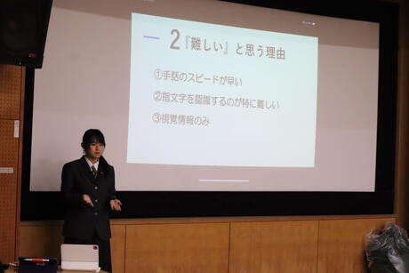 発表後にはミニ手話講座を行い、会場全体で手話の練習に取り組みました。実際に手を動かしながら学ぶことで、言葉だけに頼らないコミュニケーションの大切さを実感する時間となりました。