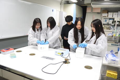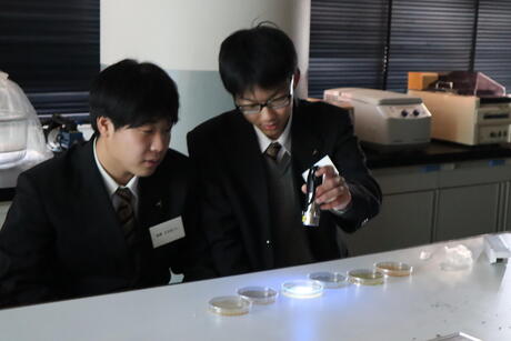 当日は、生命環境学部 生命分子化学科 生命構造化学研究室の田中俊一准教授ならびに研究室所属の学生の皆様のご指導のもと、大学の研究設備を用いた実験を体験することができ、生徒にとって非常に貴重な学びの機会となりました。遺伝子組換えについて、倫理的な観点だけでなく、進化論的視点や医療的視点など多角的に考え、議論を深めることができました。日頃の疑問を積極的に質問する様子からも、生徒たちの科学的探究心が育まれていることがうかがえました。