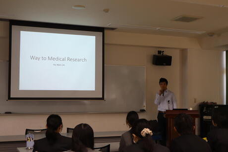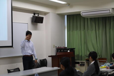 今年度は、京都府立医科大学・大学院細胞分子機能病理学研究科の Ho Wen-Jin博士(台湾出身)にお越しいただき、「マルチモーダルイメージングによる心室性不整脈難治化のメカニズムの解明」というテーマで御講義いただきました。血管修復技術や心筋瞬間凍結による実験の手法などを、動画や図、グラフ等を使って分かりやすく説明してくださいました。オールイングリッシュの講義に、生徒たちは少し緊張している様子でしたが、御専門の研究内容を教えてくださるだけでなく、研究者として研究していくための姿勢や研究の進め方について説明してくださったため、生徒たちは非常に興味を持って受講することができました。質疑応答の時間には、研究内容や研究との向き合い方についてたくさんの質問がありました。