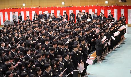 卒業生代表による答辞では、勉強や部活動、学校行事など高校生活での数々の思い出と、そこで得た仲間との絆や成長を振り返り、仲間や先生方、保護者への感謝の気持ちが式歌の歌詞になぞらえて述べられました。