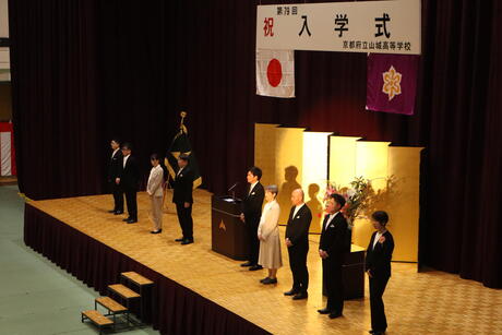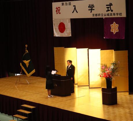 式辞において校長先生は、「創立120周年を迎える山城高校で、向上心と探究心を持ち新しいことに挑戦し、仲間と助け合いながら困難に立ち向かってほしい」と激励されました。PTA会長からは、「学校生活で出会う多くの仲間や人とのつながりを大切にしてほしい」との言葉が贈られました。入学生代表による宣誓後、分掌部長・担任紹介や学年部長挨拶が行われ、学年部長からは「前へ進む姿勢」「深く考え行動する力」「素直な心」「互いの個性の尊重」の四つのことが示されました。