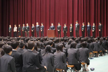また、分掌部長の先生方からも講話がありました。教務部長の先生からは、この春に卒業した先輩たちの「何事も前向きに取り組むところ」、「仲間想いのところ」、「粘り強い集団だったところ」という素敵な3点を、在校生にお話しいただきました。進路指導部長の先生からは、昨年度の卒業生の進路実績を紹介され、先輩方が進路実現に向けて粘り強く努力された様子や、「どっちかではなく、どっちもに挑戦してほしい」というお話がありました。生徒指導部長の先生からは、身だしなみ・自転車についての注意点や、部活動などでの悔いの残らない学校生活を送るためのお話がありました。