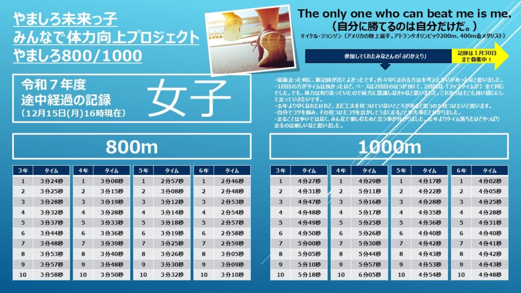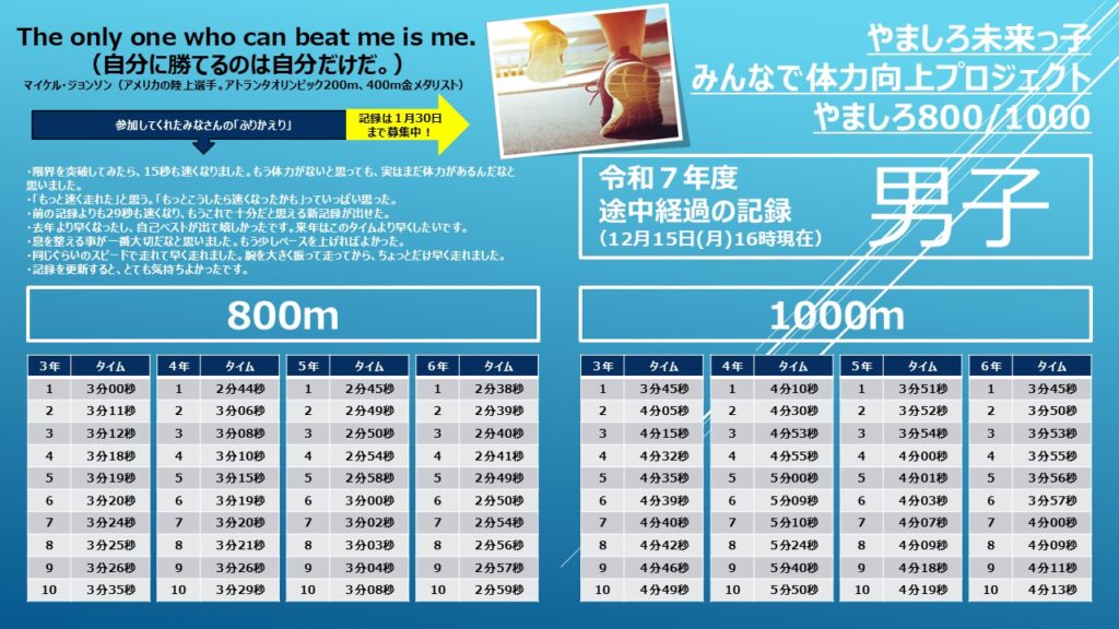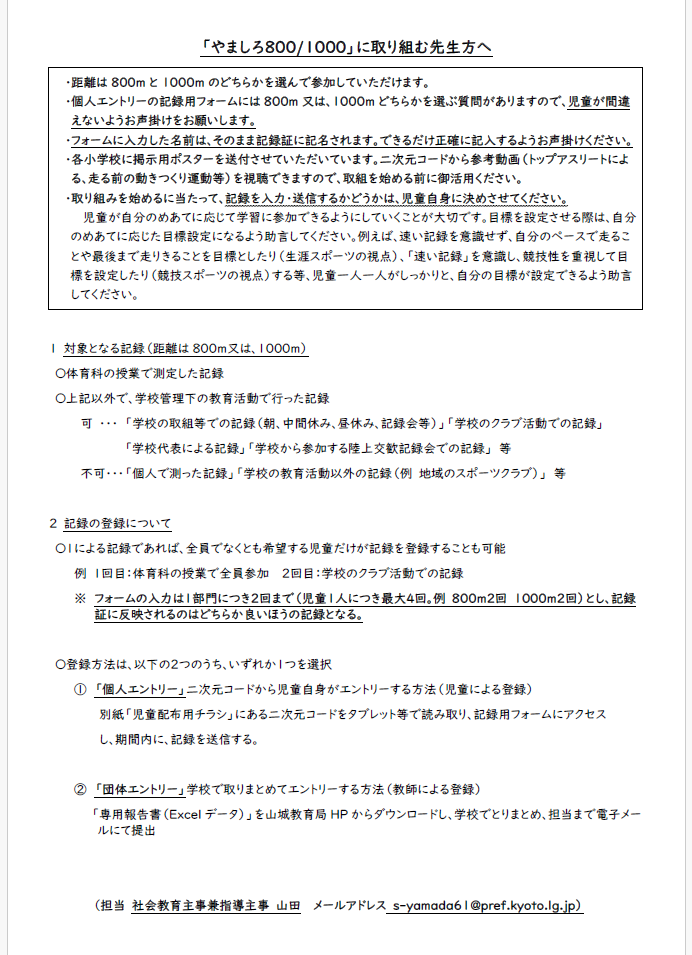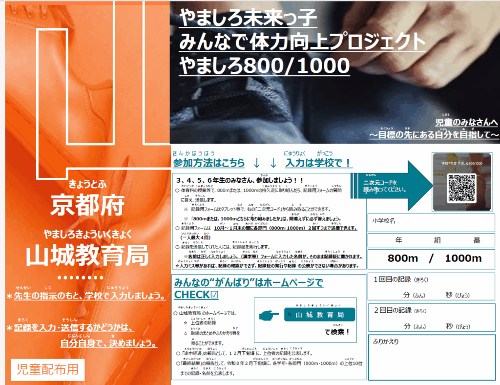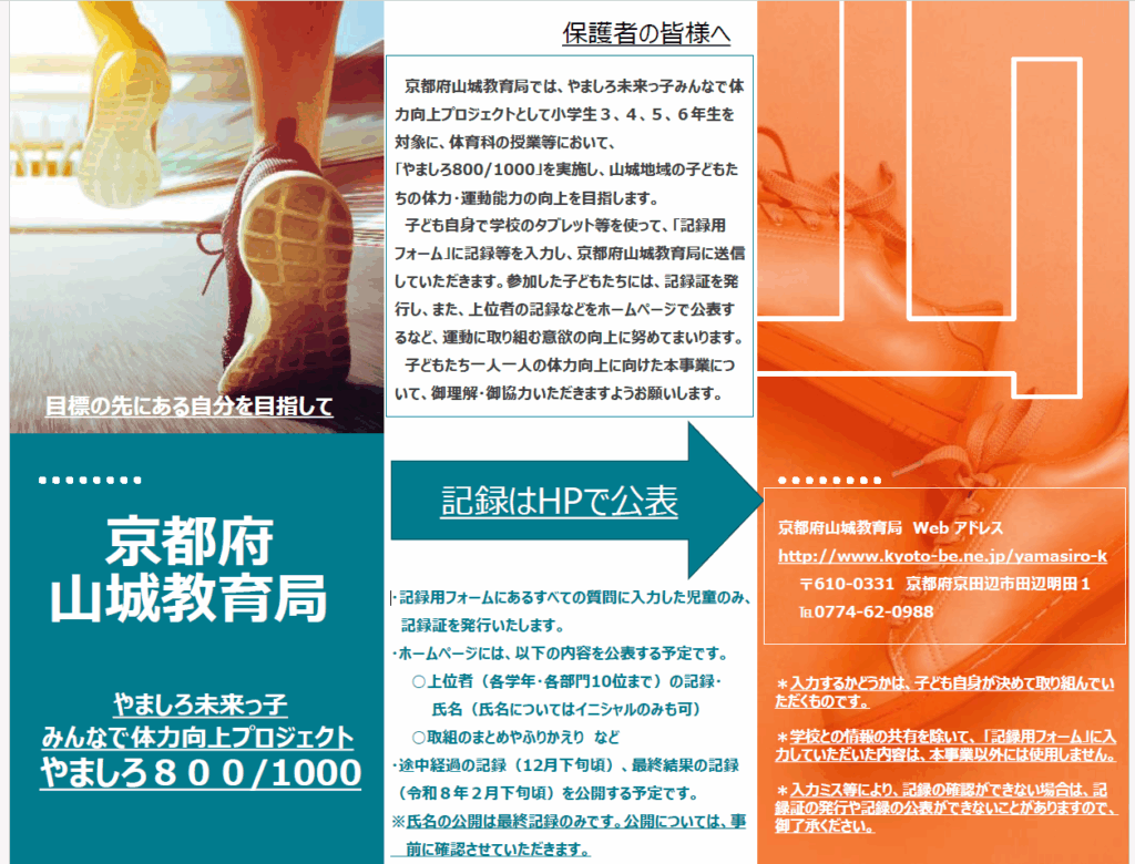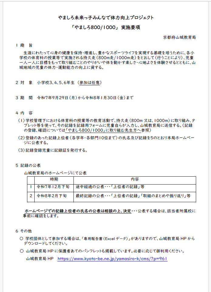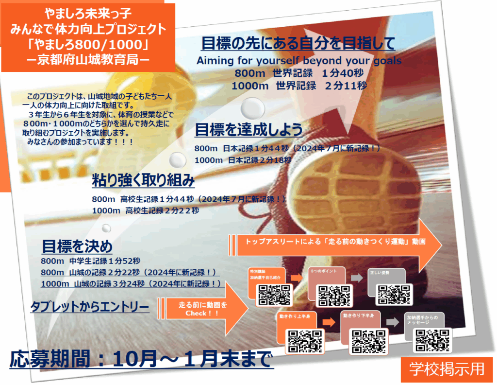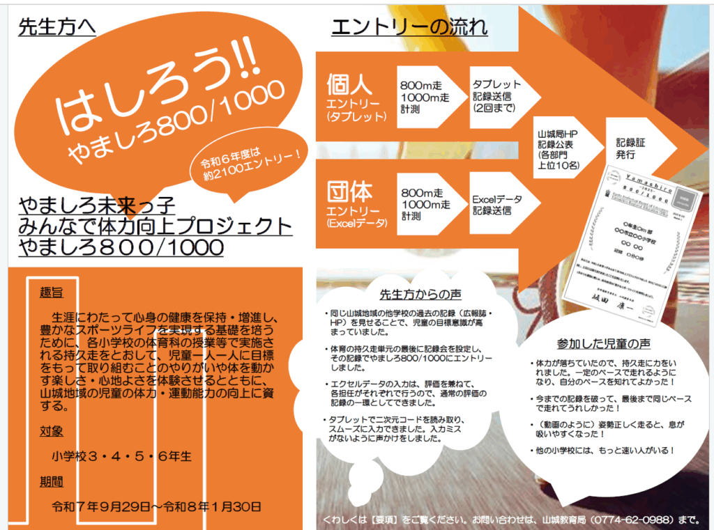 このプロジェクトは、山城地域の子どもたち一人一人が生涯にわたって心身の健康を保持・増進し、豊かなスポーツライフを実現する基礎を培うための取組です。今年度は中学年と高学年を対象に、各小学校の体育科の授業等で800m走・1000m走のどちらかを選び取り組むことで、児童に目標をもつことや体を動かす楽しさ・心地よさを体験させるとともに、山城地域の児童の体力・運動能力の向上を目指します。(この取組は任意です。)