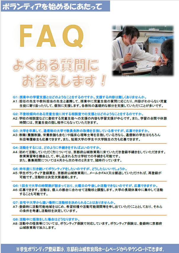 京都府山城教育局では、教職等を目指している大学生・大学院生・短大生をボランティアとして山城地域の小・中学校に派遣し、子どもたちへのきめ細かな学習支援を行う「学生パワー活用事業」を平成17年度から実施しています。