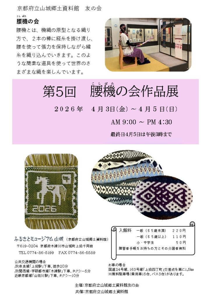 今回、京都府立山城郷土資料館友の会有志による「腰機の会」会員の作品展を開催します。ぜひ御観覧ください。