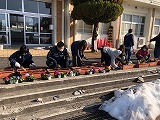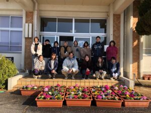 2月20日(日)、PTA家庭教育委員会主催による「花植え」を実施しました。当日は家庭教育委員会・本部役員・運営委員様にて、プランターに色とりどりの花を植えていただき、職員玄関前と生徒昇降口前に飾りました。今後は卒業式や入学式でも使用していく予定です。