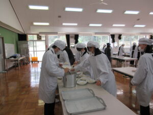 給食当番活動にまだ慣れていない1年生のために、生徒会の3年生生徒がしばらくの間お手伝いをしてくれます。3年生からやり方を教えてもらい、「どんどん入れていって。」「上手だよ!」と心強い声かけをしてもらい、初めての給食当番がスムーズに進んでいました。