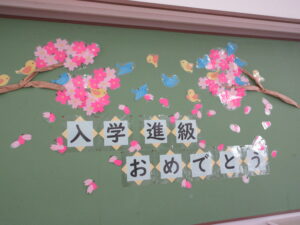 先週入学したばかりの1年生を迎え、今日から全校揃っての給食が始まりました。ランチルームでは、「入学・進級おめでとう」の文字と桜の掲示物が新入生を出迎えました。
