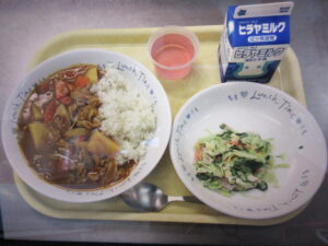 小学校と比べると分量が多い中学校の給食ですが、人気メニューのカレーということもあり1年生もしっかり食べきっていました。食欲があって、元気いっぱいの1年生です。
