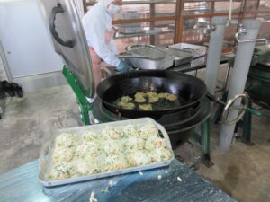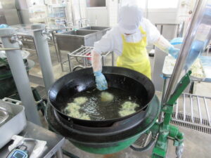 カリッと揚がった揚げ物は給食室の得意料理です。一斗(18リットル)のたっぷりの油を使って揚げるので、カリッときれいに仕上がるのです。