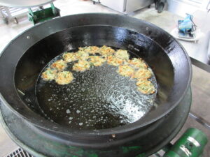 家でも上手に作るのが難しいかき揚げですが、ひとつひとつ丁寧にまとめて油に入れていきます。