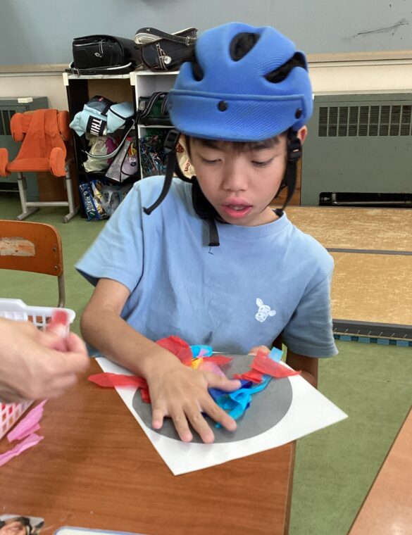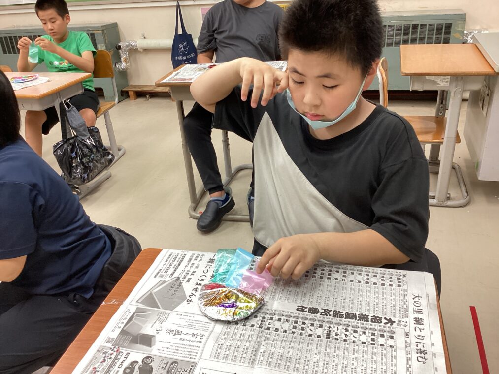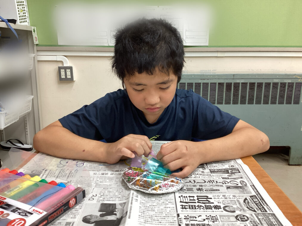 今回は「クラゲ」作りに挑戦しました。前回と同じ工程で作業を進めていくことで、見通しをもって取り組むことができました。個性あふれるキラキラのクラゲが完成しました。 |
