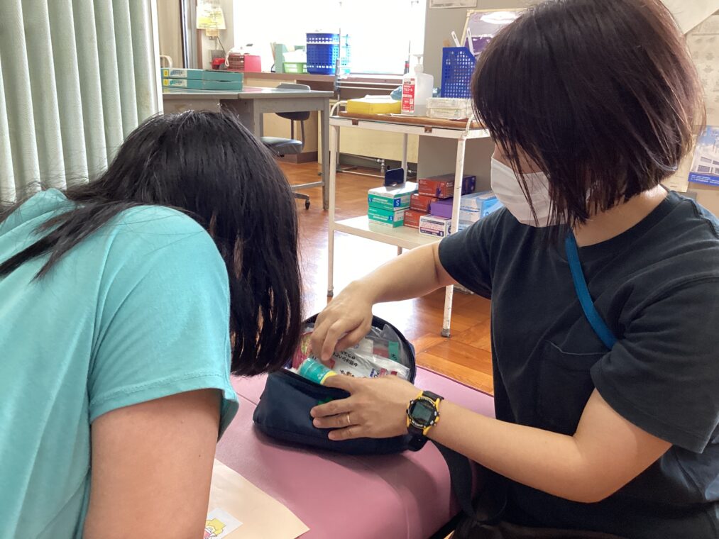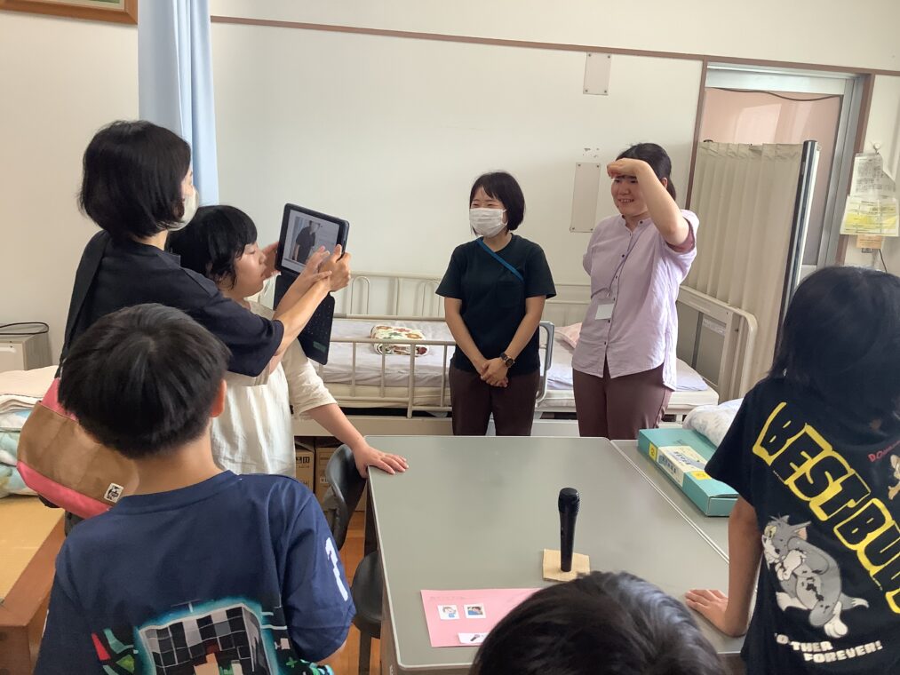 保健室のお仕事を知るために、お仕事の内容や嬉しいこと、大変なことを保健室の先生に質問したり、保健室にある用具や救急セットを写真に撮らせてもらったりして、お仕事について知ることができました。話を真剣な表情で聞いたり、怪我をしてしまったらこれを使うんだよねと自分の経験から感想を伝えたりしていました。 |