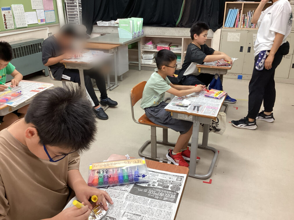 旅行当日に持っていくお菓子を買いにゴダイドラッグへ行きました。300円以内になるように値段を確認しながら、欲しいお菓子を上手に選んで購入することができました。4・5年生は壮行会に向けて6年生への思いを込めた横断幕を制作しました。 |