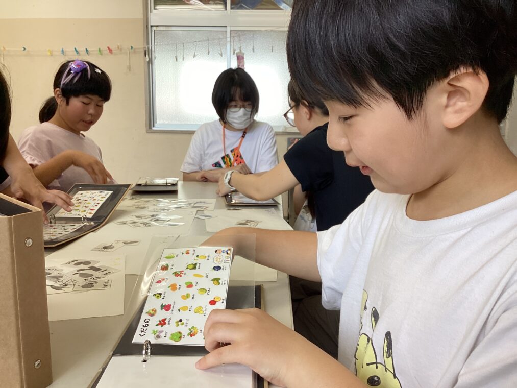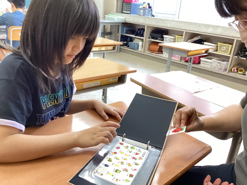 イラストカードに描かれているものを、絵本を使って調べて分類する学習に取り組んでいます。珍しい食物も、絵本から見つけて野菜や果物に分けたり、色を調べて分けたりと、みんなで協力をして分けることができました。 |