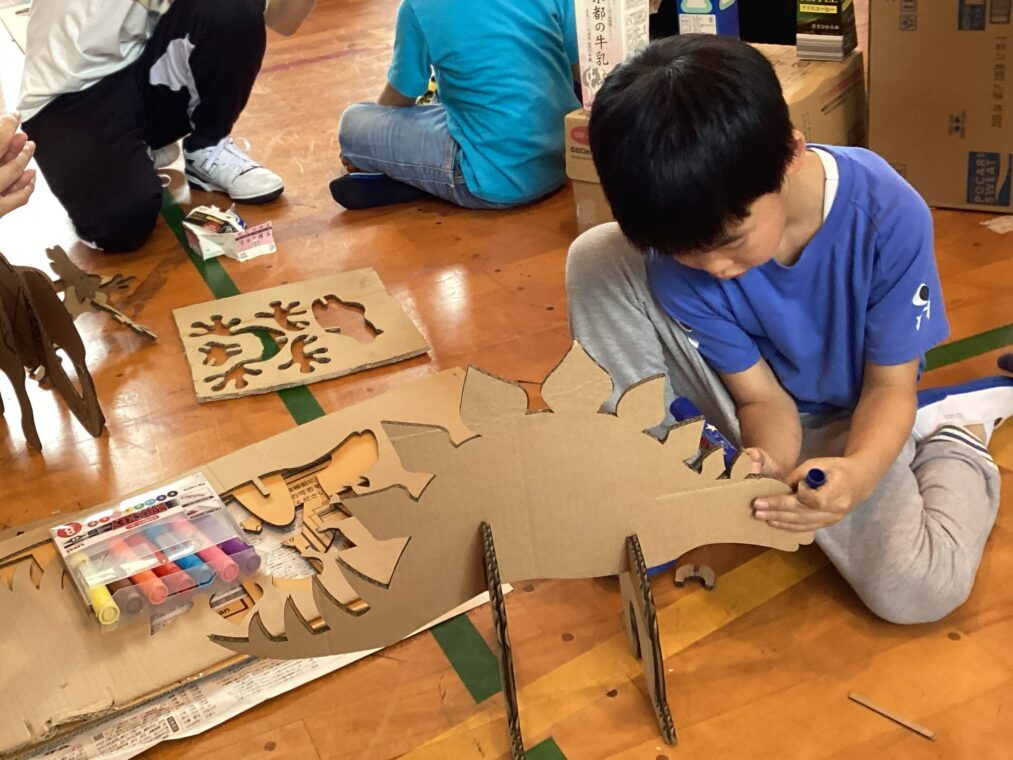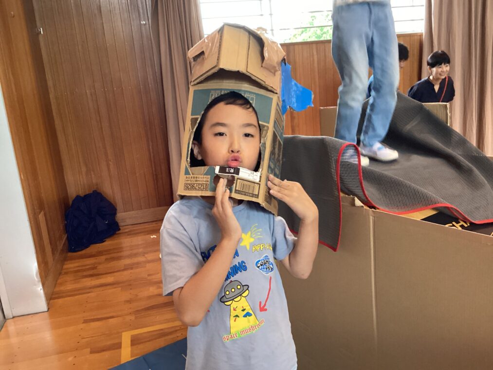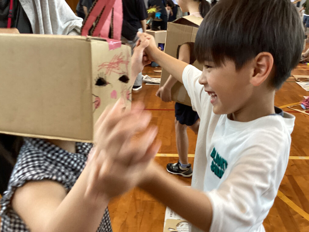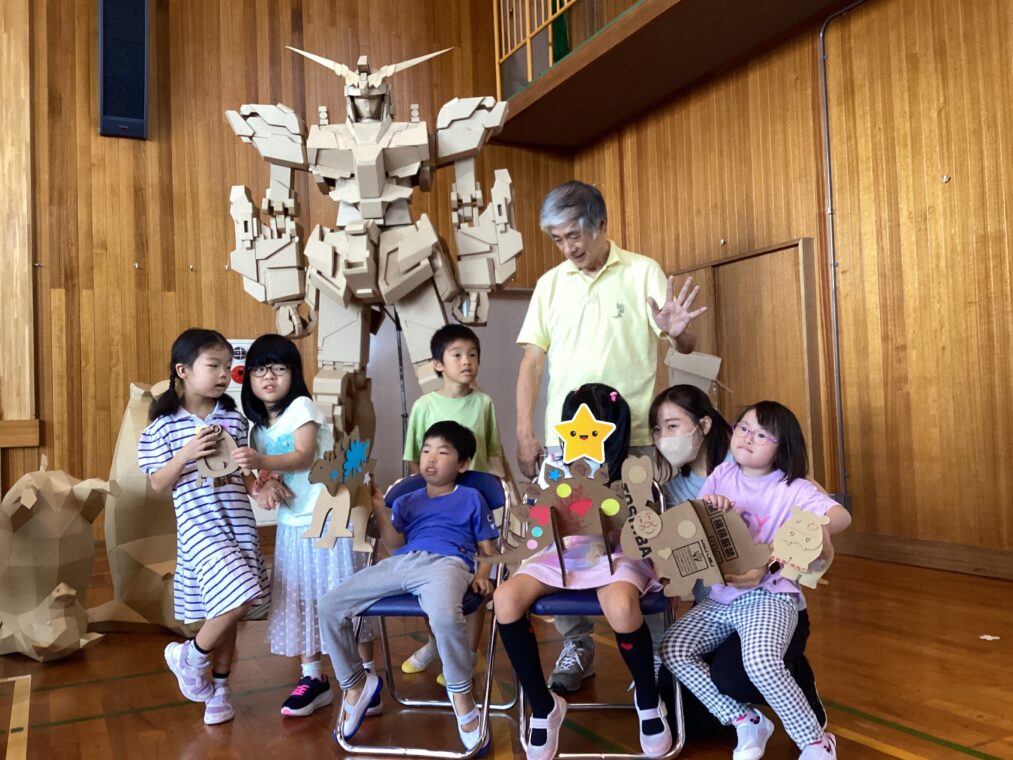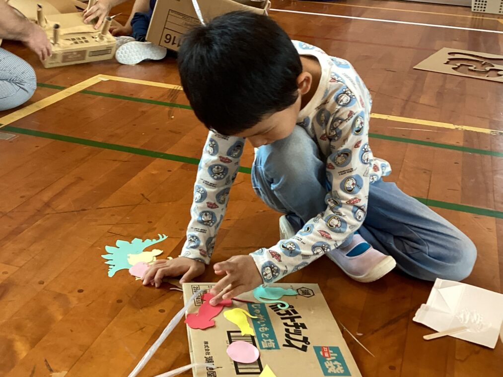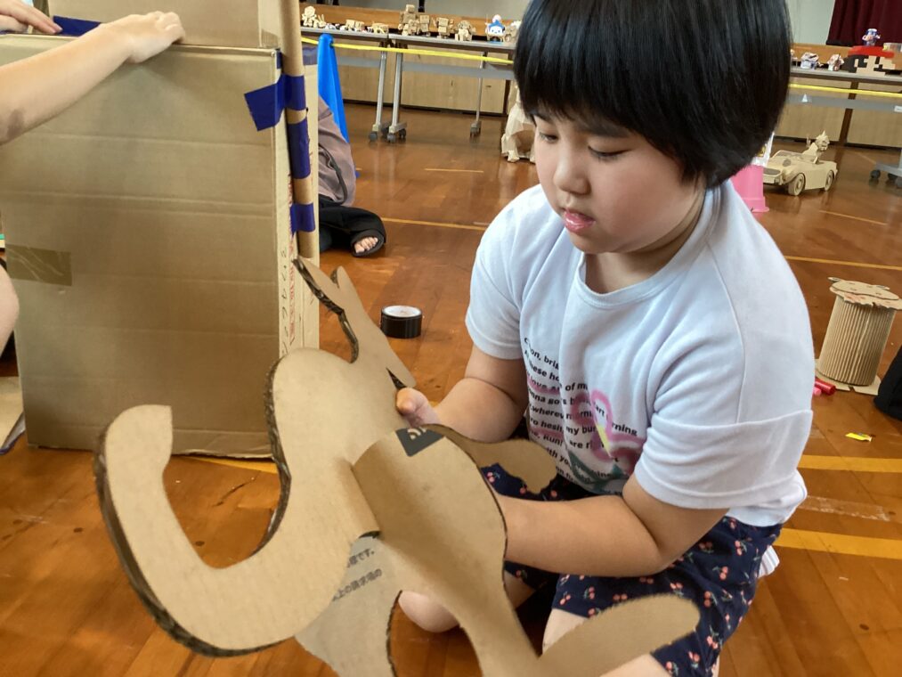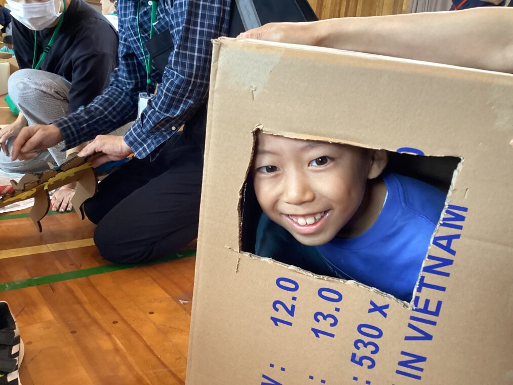 9月25日(木)に、地域協働学習の一環として、夢形エンジニアの千田雅彦様をゲストティーチャーにお招きし、段ボールアートに取り組みました。千田様の制作された大型作品や可愛い動物の作品を目にした子ども達は、「すごい!!」と目を輝かせていました。今回は保護者の方にも御参加いただき、親子で協力して作品を作ったり、「これを作りたい!!」と意欲的に段ボールを切って組み立てたり、段ボール製の大きな滑り台で遊んだりと、思い思いに段ボールにふれながら創作活動を楽しみました。個性あふれる作品がたくさん完成し、ものづくりの楽しさを存分に味わうことができました。
