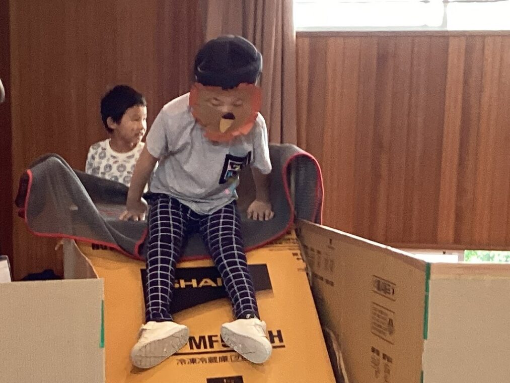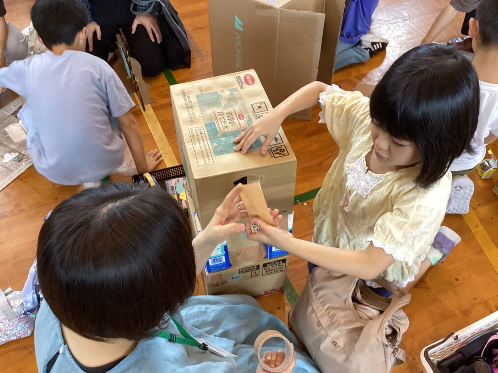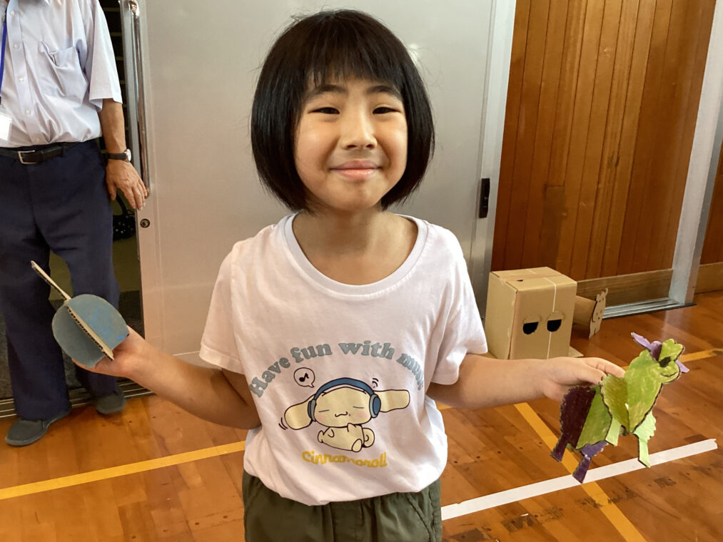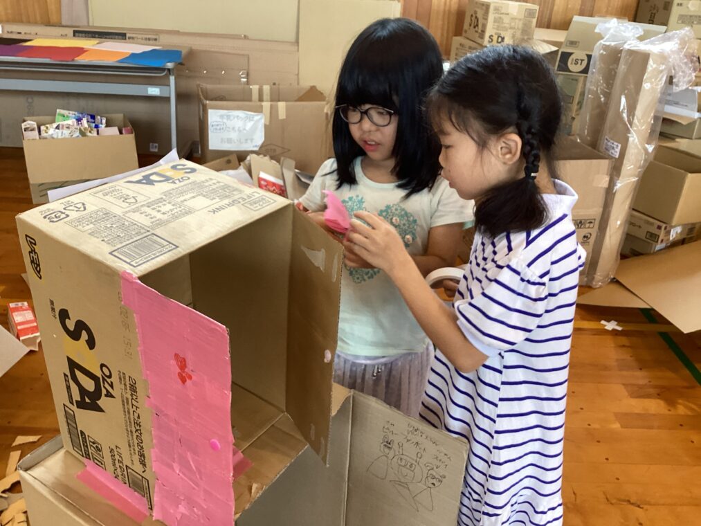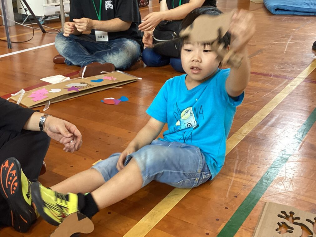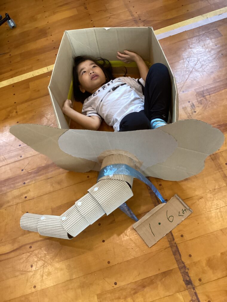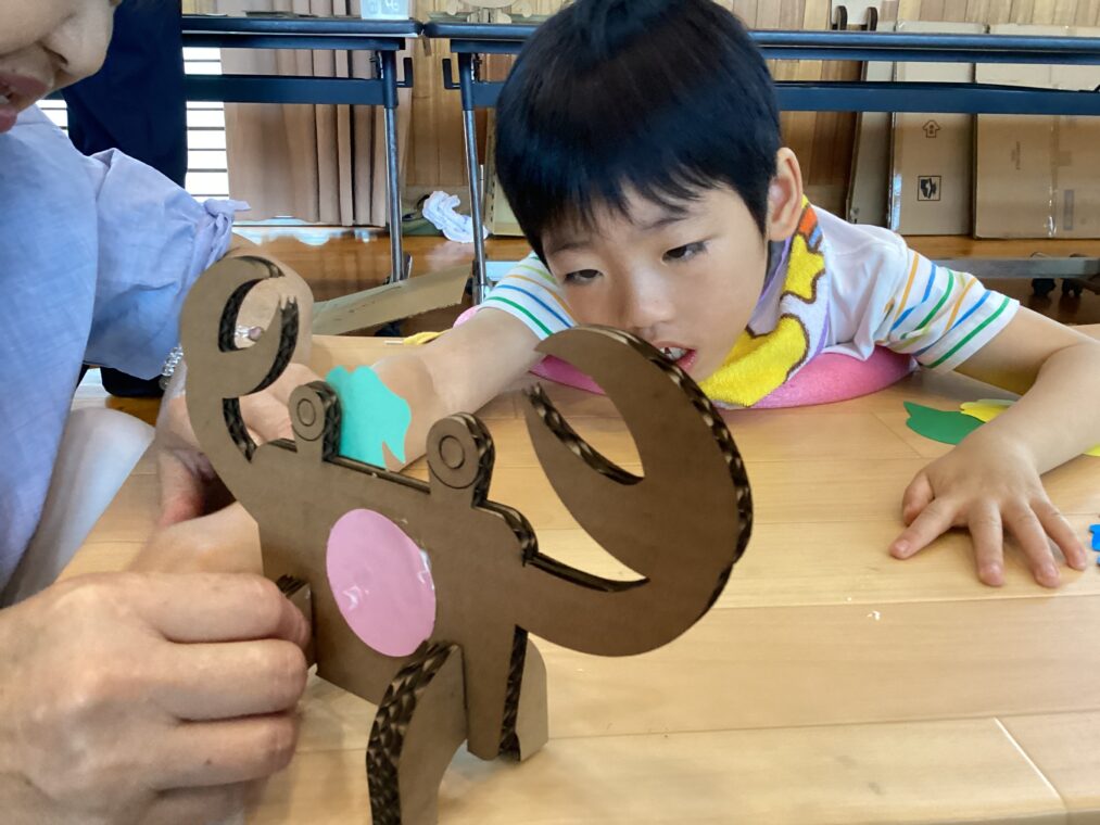 9月25日(木)に、地域協働学習の一環として、夢形エンジニアの千田雅彦様をゲストティーチャーにお招きし、段ボールアートに取り組みました。千田様の制作された大型作品や可愛い動物の作品を目にした子ども達は、「すごい!!」と目を輝かせていました。今回は保護者の方にも御参加いただき、親子で協力して作品を作ったり、「これを作りたい!!」と意欲的に段ボールを切って組み立てたり、段ボール製の大きな滑り台で遊んだりと、思い思いに段ボールにふれながら創作活動を楽しみました。個性あふれる作品がたくさん完成し、ものづくりの楽しさを存分に味わうことができました。