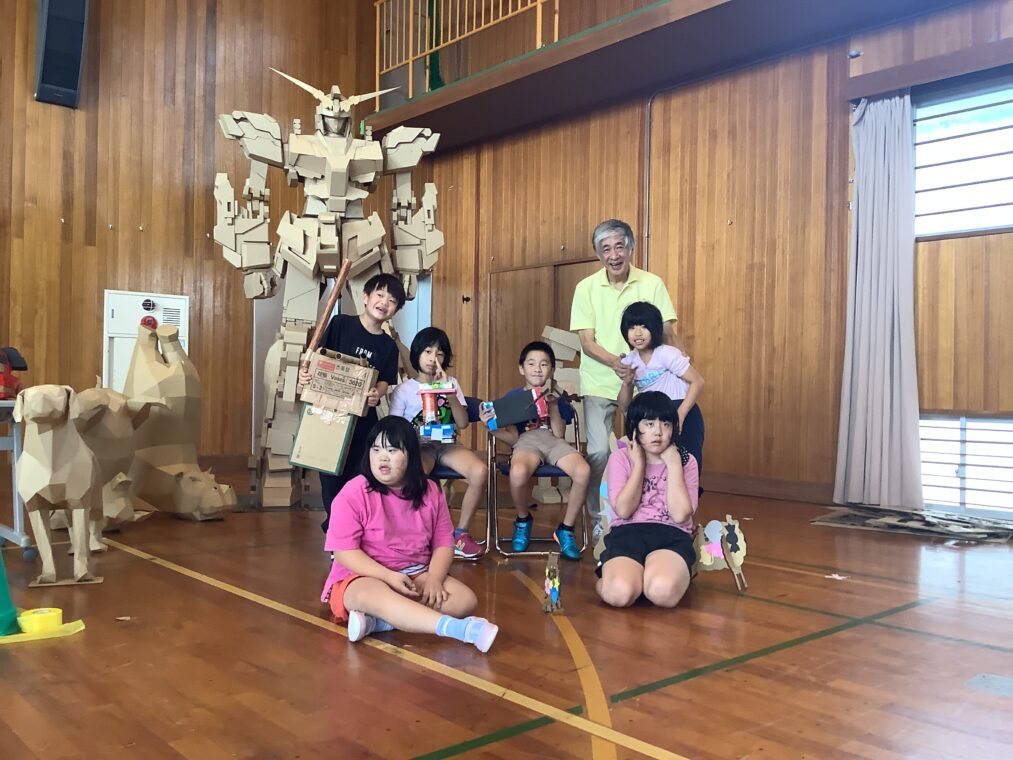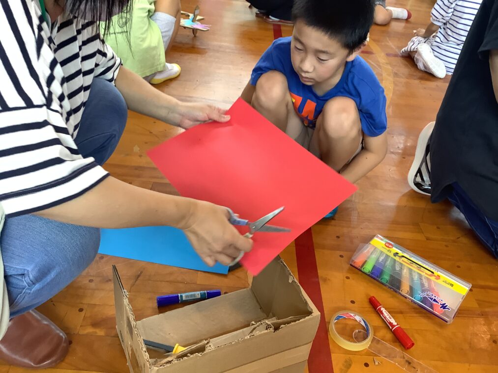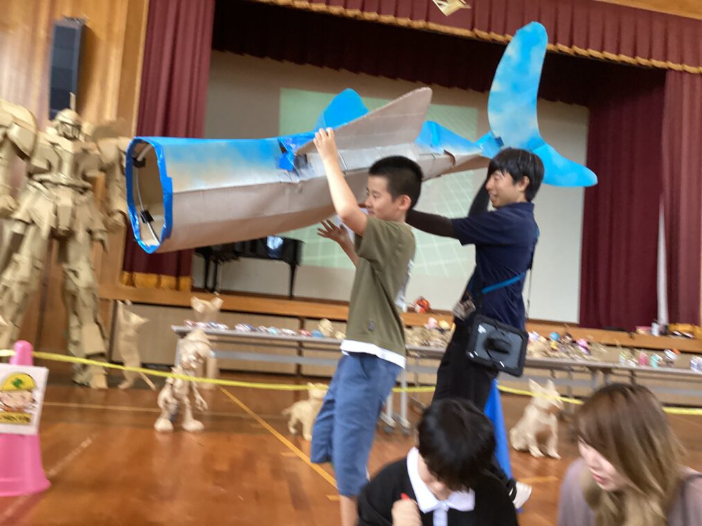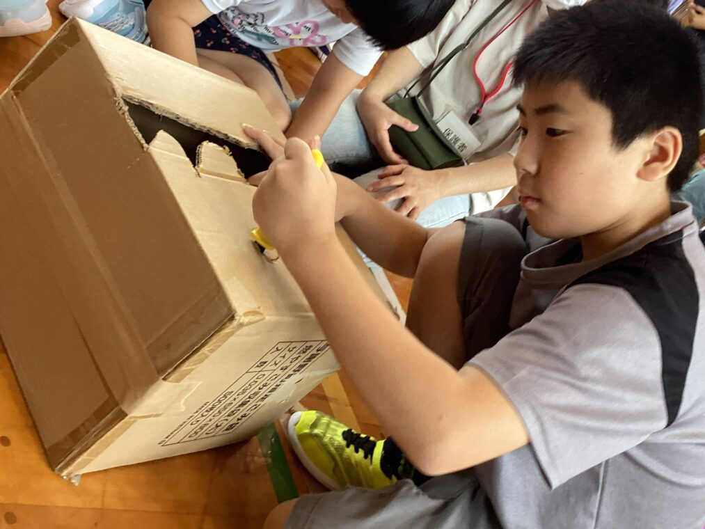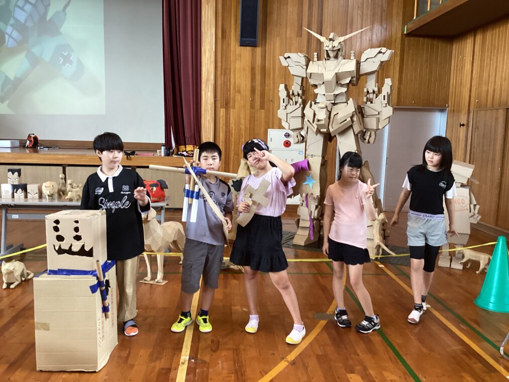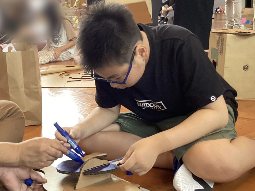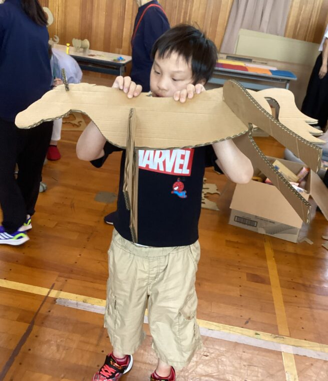 9月25日(木)に、地域協働学習の一環として、夢形エンジニアの千田雅彦様をゲストティーチャーにお招きし、段ボールアートに取り組みました。千田様の制作された大型作品や可愛い動物の作品を目にした子ども達は、「すごい!!」と目を輝かせていました。今回は保護者の方にも御参加いただき、親子で協力して作品を作ったり、「これを作りたい!!」と意欲的に段ボールを切って組み立てたり、段ボール製の大きな滑り台で遊んだりと、思い思いに段ボールにふれながら創作活動を楽しみました。個性あふれる作品がたくさん完成し、ものづくりの楽しさを存分に味わうことができました。