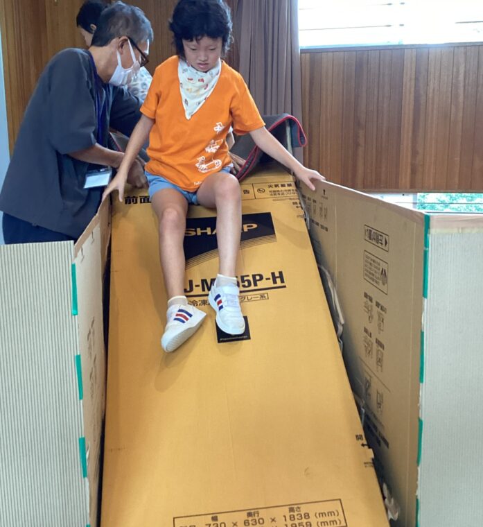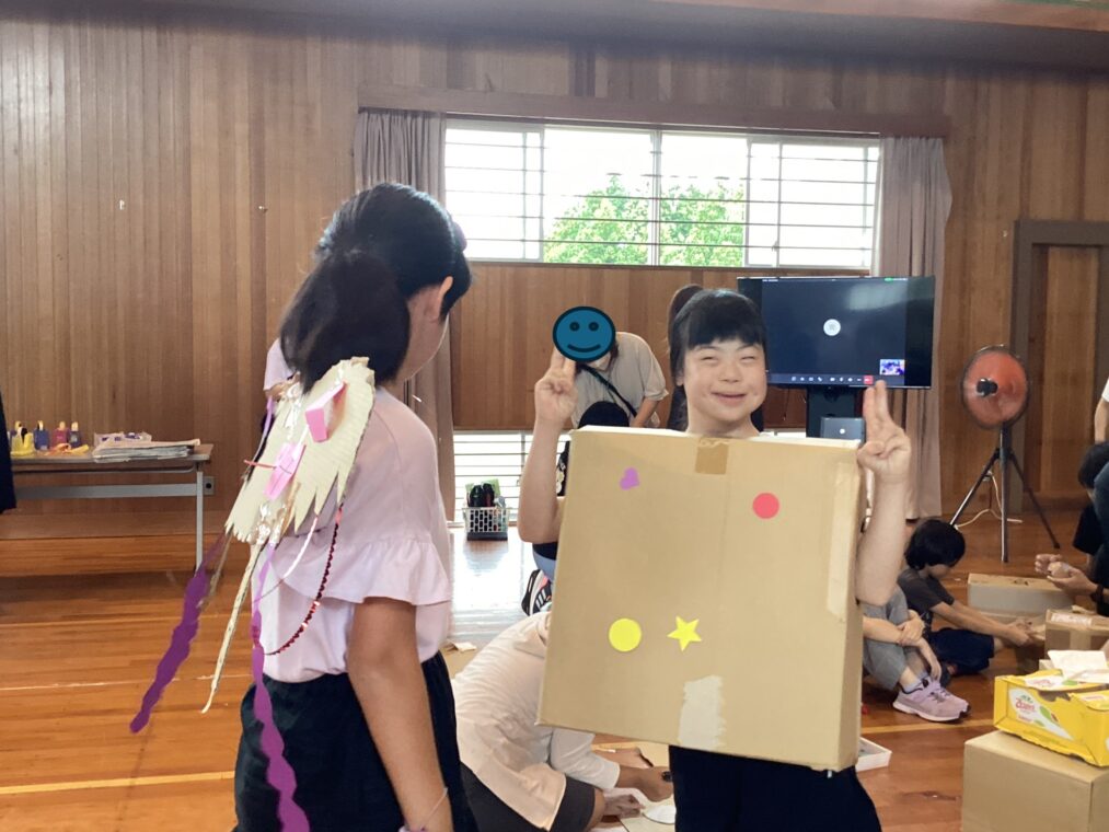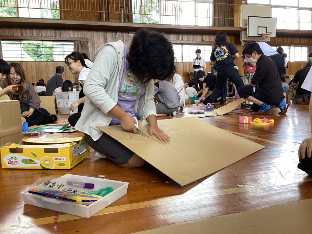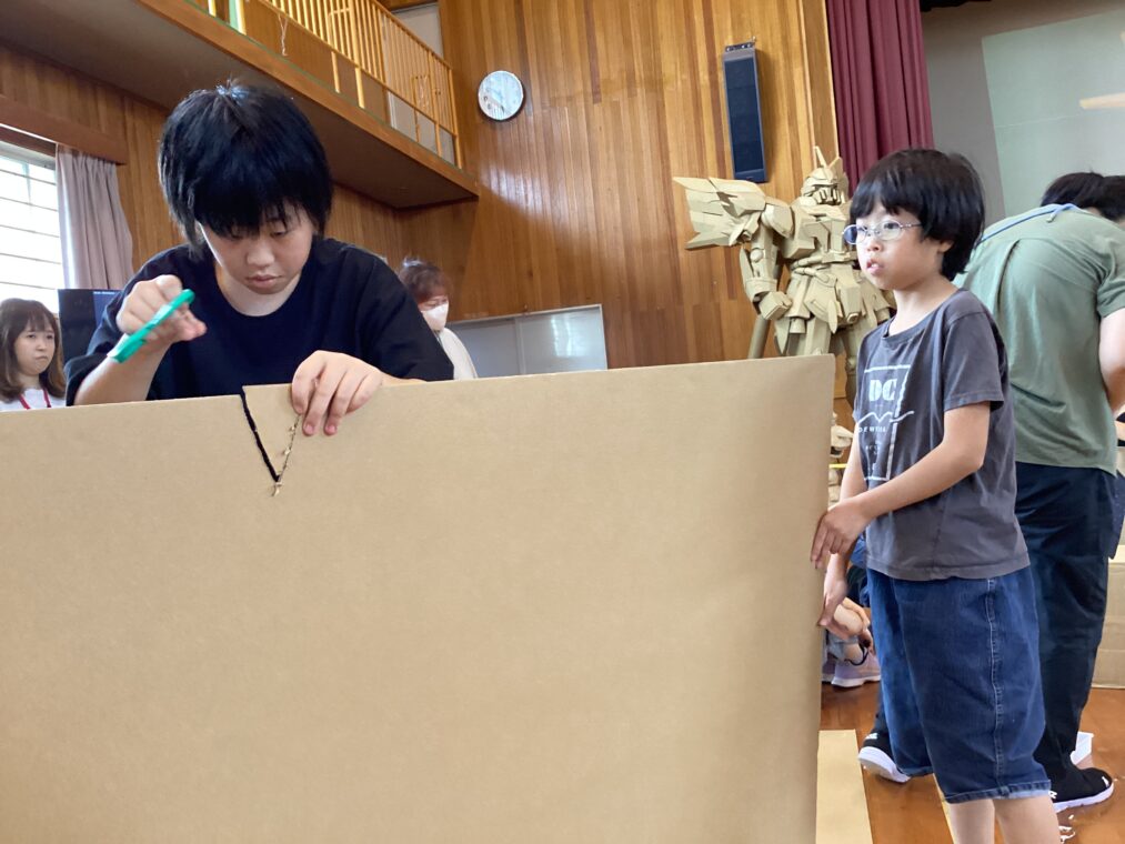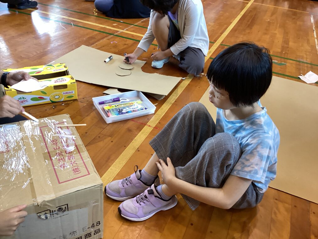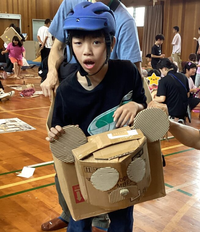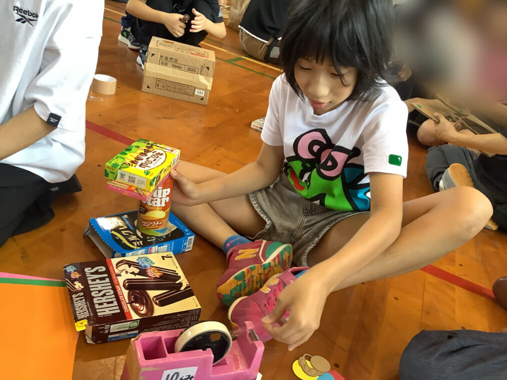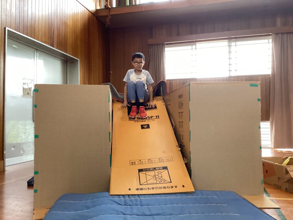 9月25日(木)に、地域協働学習の一環として、夢形エンジニアの千田雅彦様をゲストティーチャーにお招きし、段ボールアートに取り組みました。千田様の制作された大型作品や可愛い動物の作品を目にした子ども達は、「すごい!!」と目を輝かせていました。今回は保護者の方にも御参加いただき、親子で協力して作品を作ったり、「これを作りたい!!」と意欲的に段ボールを切って組み立てたり、段ボール製の大きな滑り台で遊んだりと、思い思いに段ボールにふれながら創作活動を楽しみました。個性あふれる作品がたくさん完成し、ものづくりの楽しさを存分に味わうことができました。