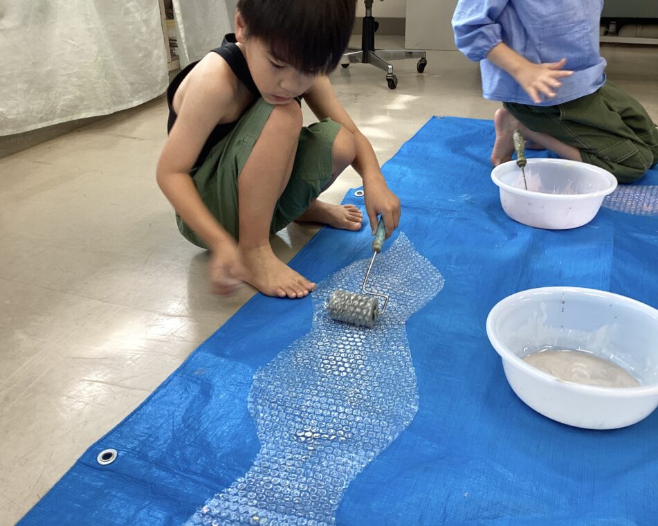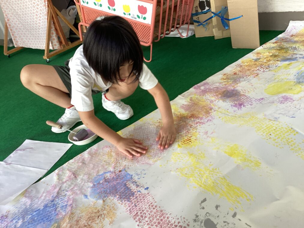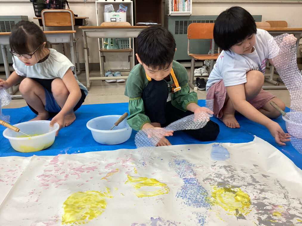 大きな模造紙に皆で「スイミー」の作品の背景を描きました。気泡緩衝材やアクリル板に絵の具を塗り、それを模造紙に押し当てて背景の模様や岩や昆布を表現しました。色の重なりを楽しみながら取り組むことができました。 |
