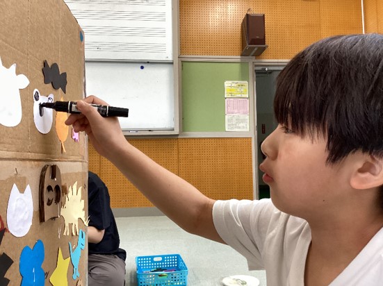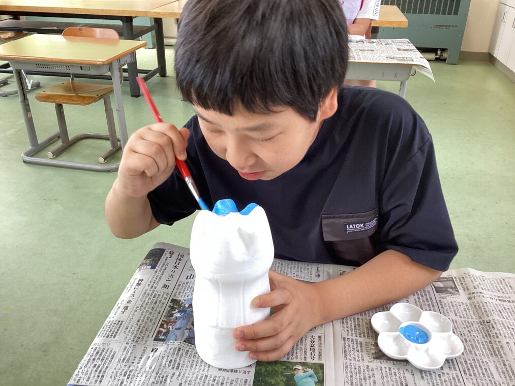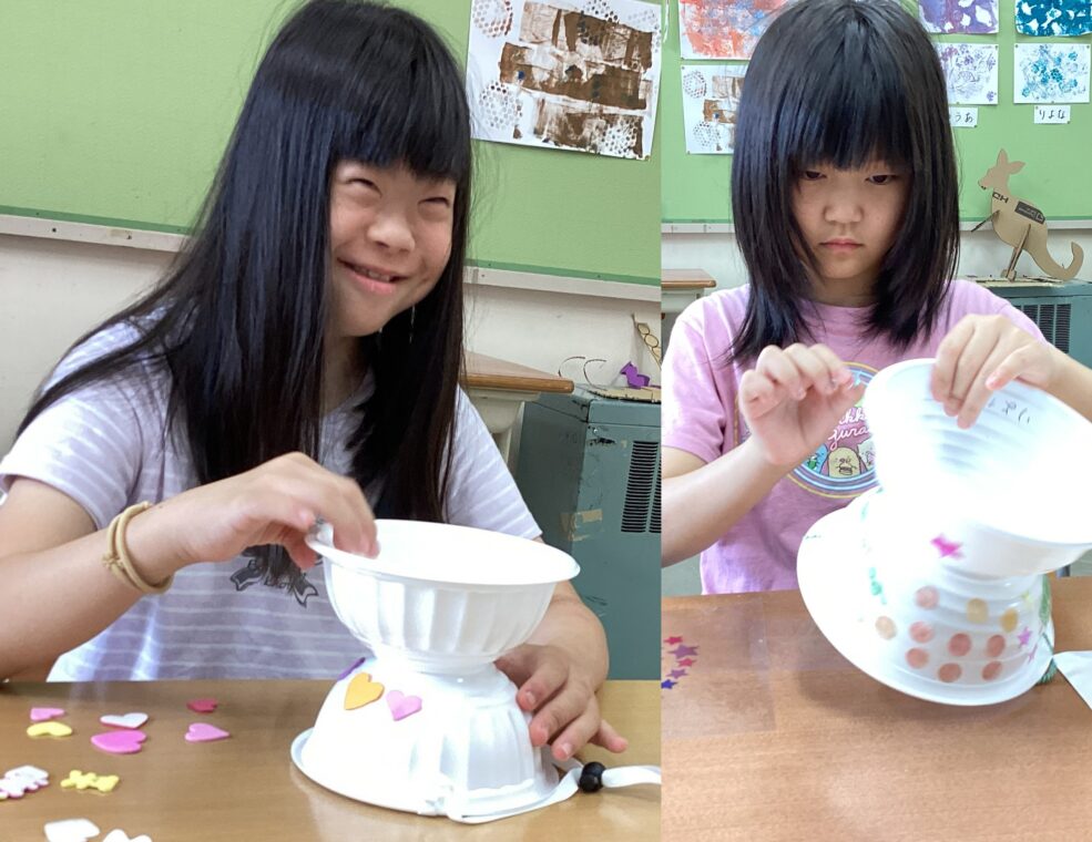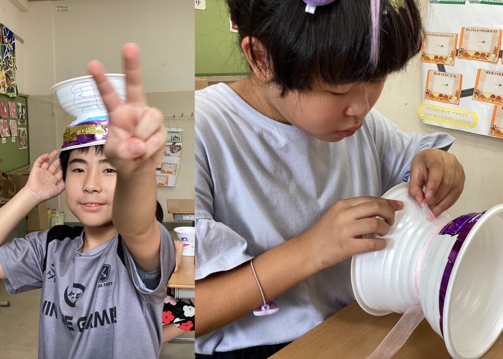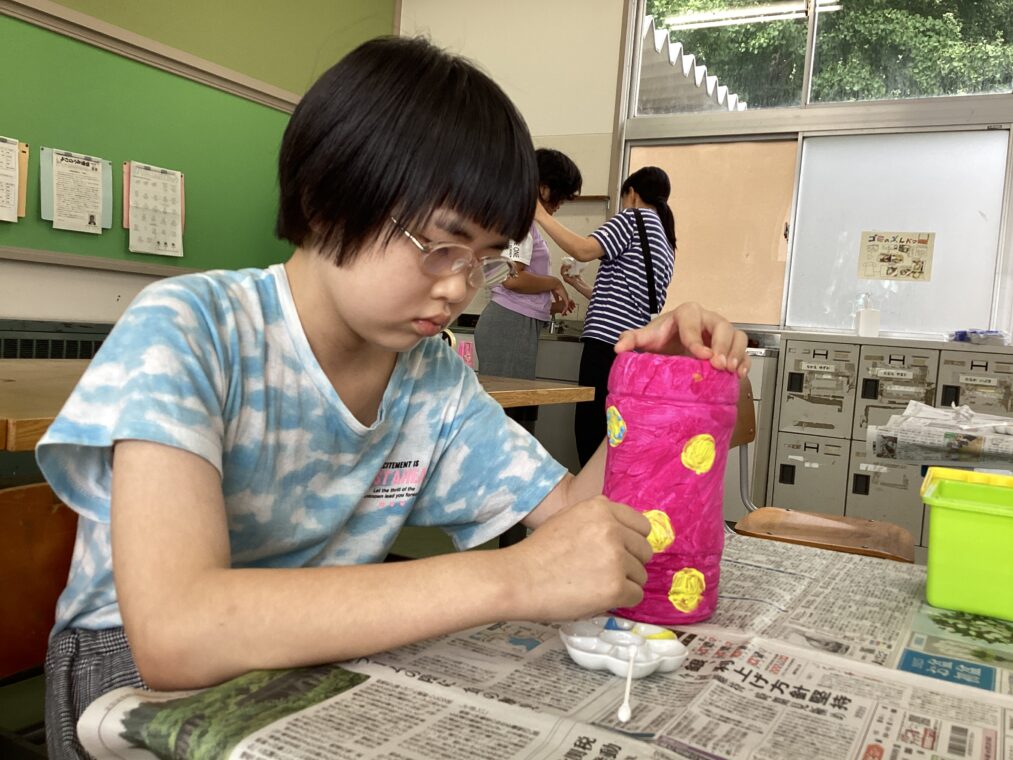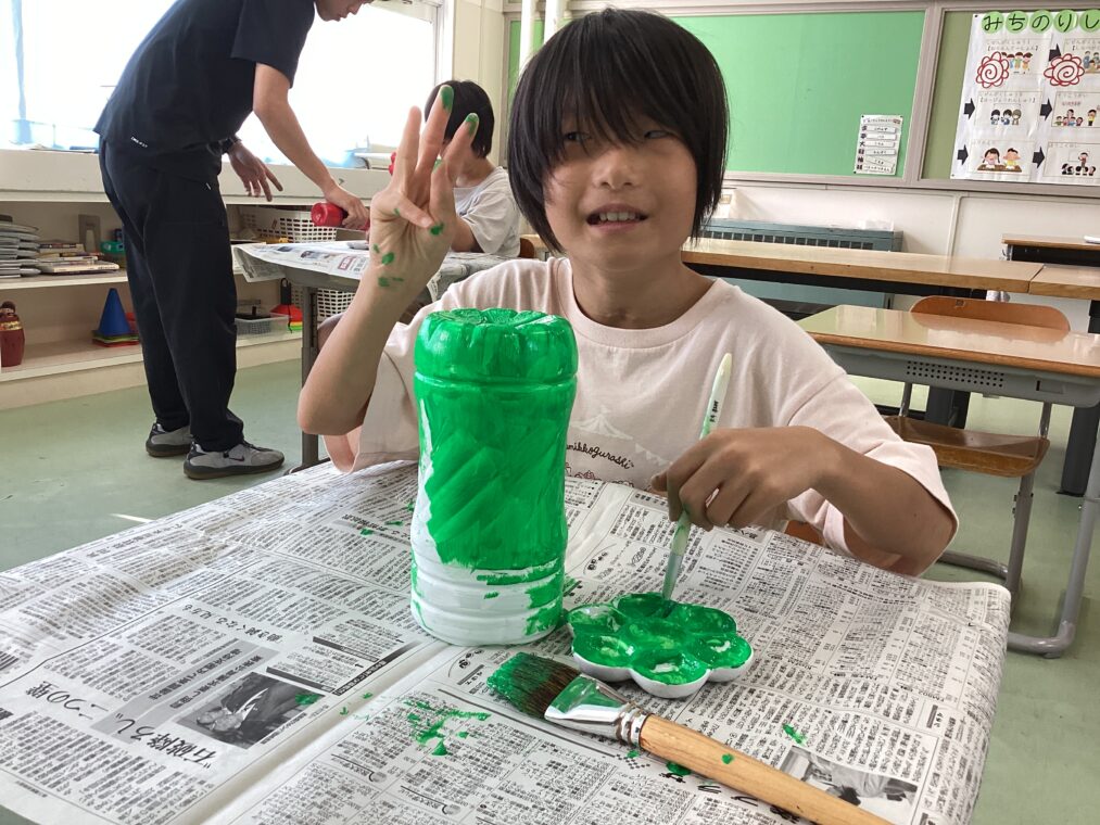 ペットボトルを使って植木鉢を作りました。絵の具を塗った上にドットペイントでそれぞれが思い思いのデザインを描きました。現在、この植木鉢にはコスモスを植えています。もう少しで花が咲きそうです! |