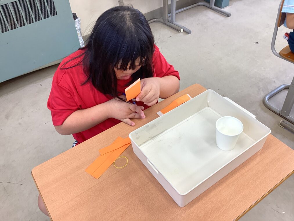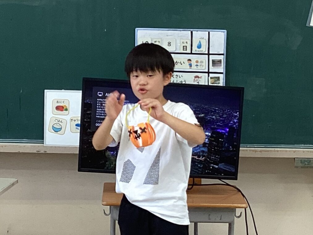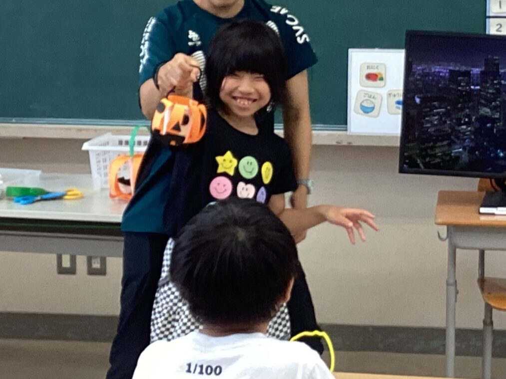 ハロウィーンに向けて、おばけかぼちゃの小物入れを作りました。画用紙を線に沿って短冊状に切り、紙コップに貼りつけます。顔のパーツや持ち手は自分で選び、色々な表情のかぼちゃが完成しました。 |