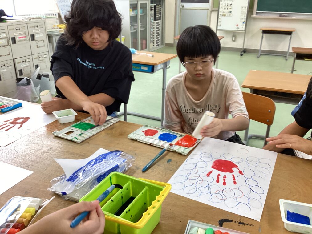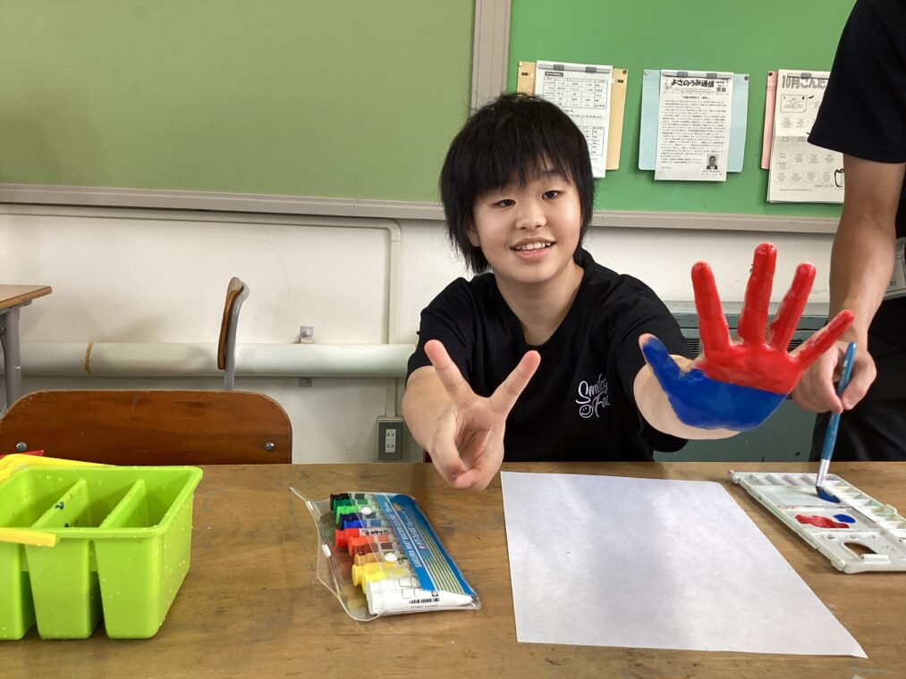 | 11月29日実施の学習発表会「YOSAフェスティバル」の看板作りをしました。全校生から集めた原画をもとに、新しい看板ができる予定です。10組は、すきないろをテーマに製作をしました。手型を木に見立ててまわりにすきな色で模様をつけました。 |