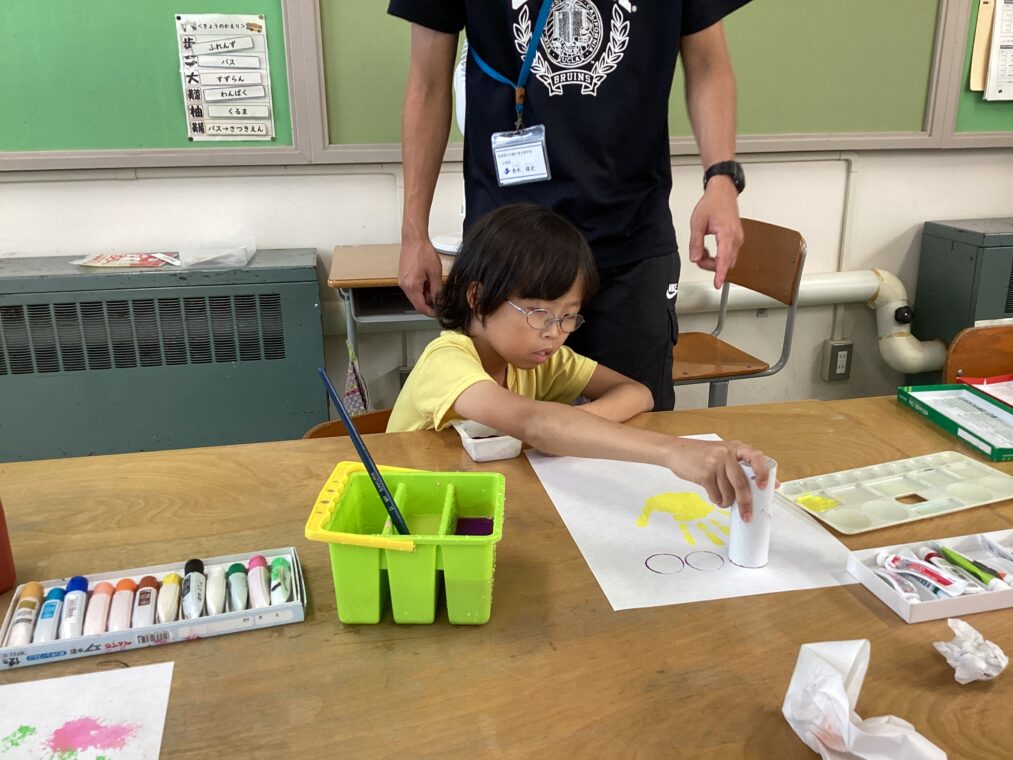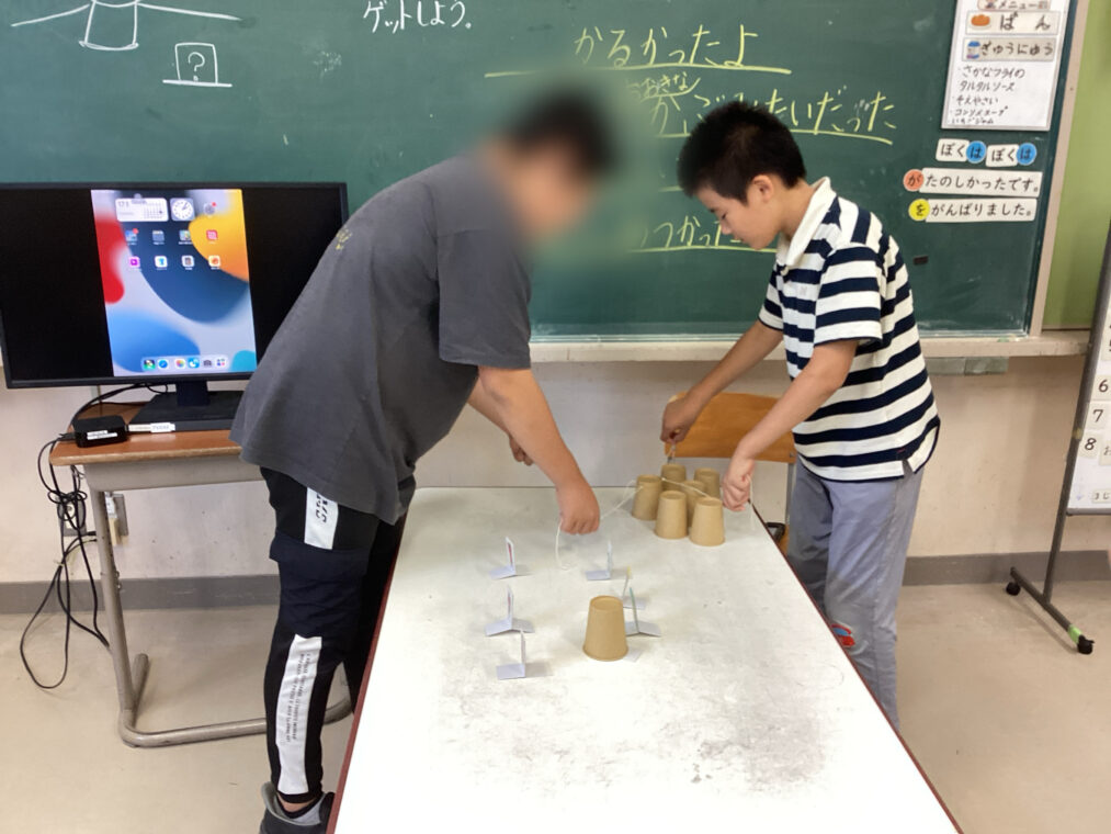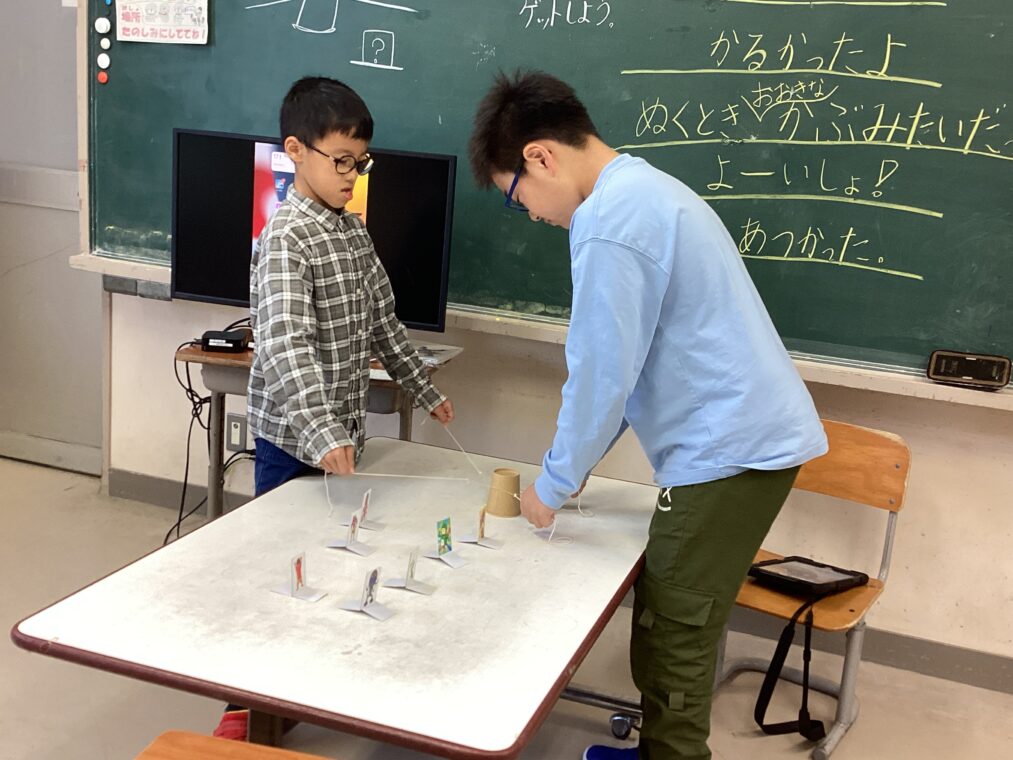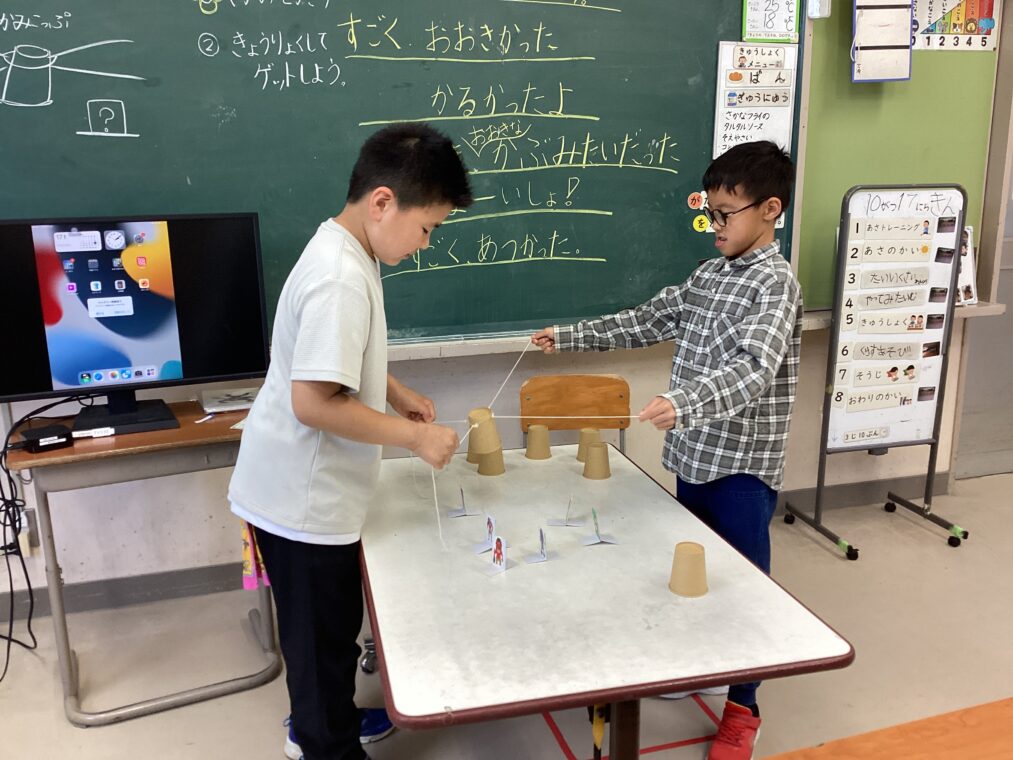 | 友達と2人で息を合わせてひもを引っ張って輪ゴムを伸ばし、力加減を調整しながら紙コップをキャッチ!そのまま移動させて、目標のキャラクターにかぶせるという遊びにチャレンジしました。ペアの友達やルールを少しずつ変えながら、何度も楽しんで遊びました。 |