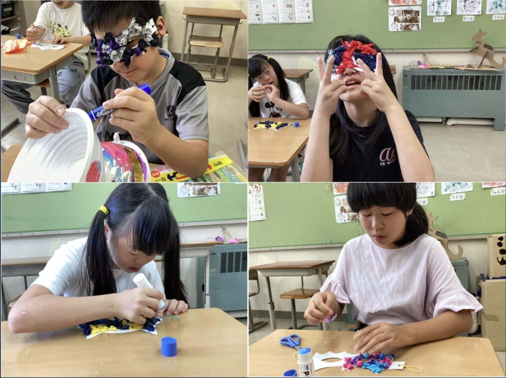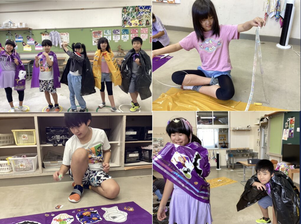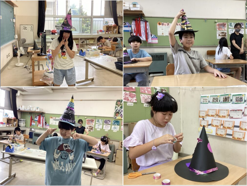 | 帽子やマント、アイマスクなどハロウィンに向けて、自分の好きなキャラクターや色などをイメージしながらどんどん制作を進めています。31日には制作したグッズを身に着け、ハロウィンパーティーをする予定です。 |