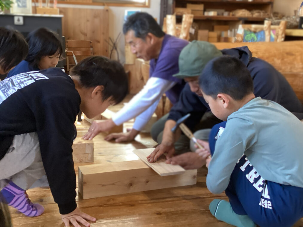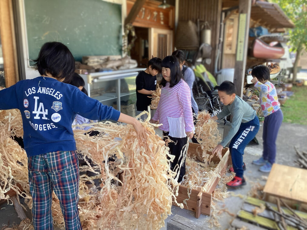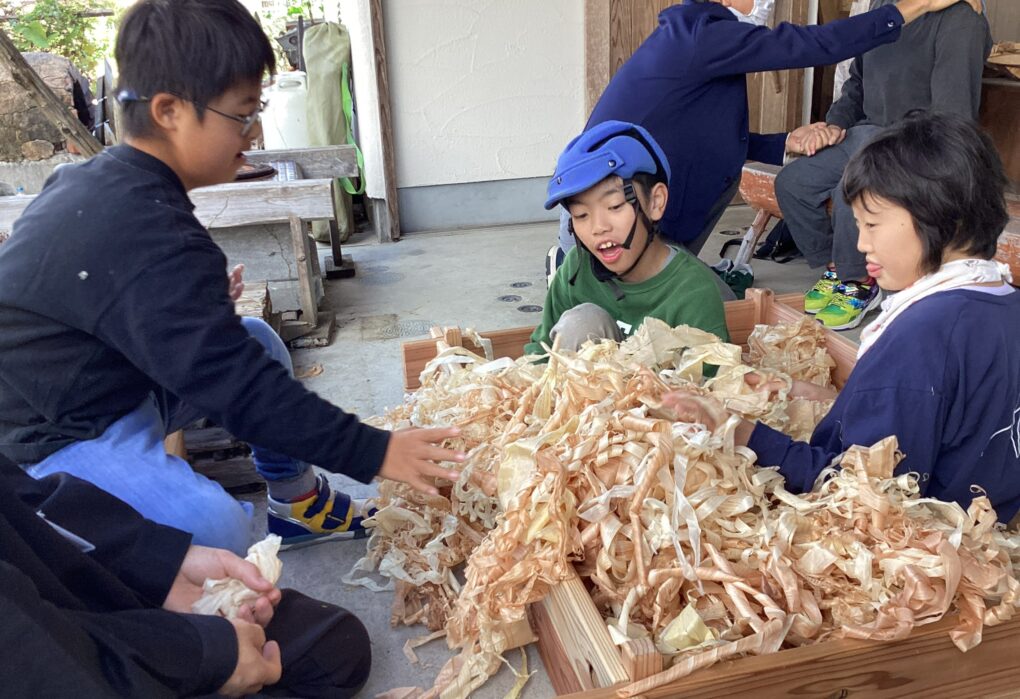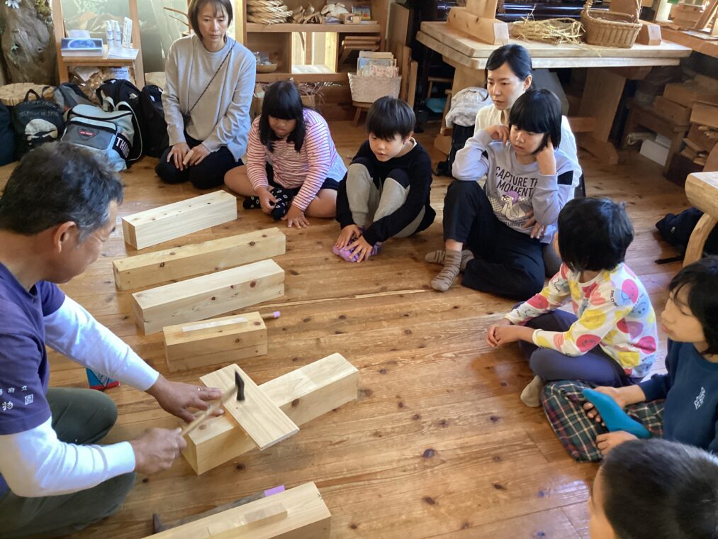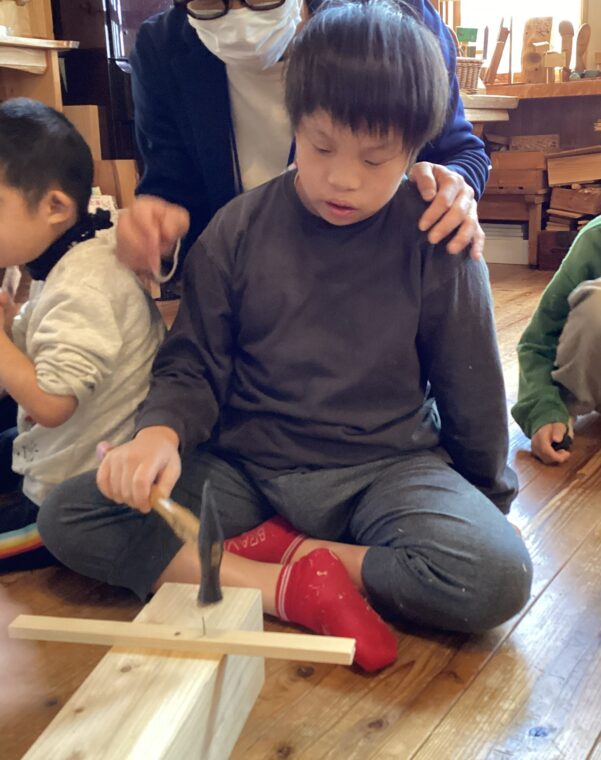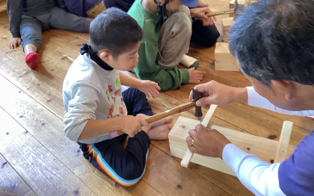 | 大工さんの仕事を調べるために校外学習に行きました。トンカチ体験で木に釘を打って大工さんの仕事のすごさを感じたり、沢山のかんなくずに触れて木の感触や匂いを感じたりしました。初めての体験に興味津々で見たり、聞いたりする姿がありました。 |