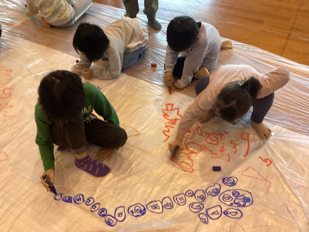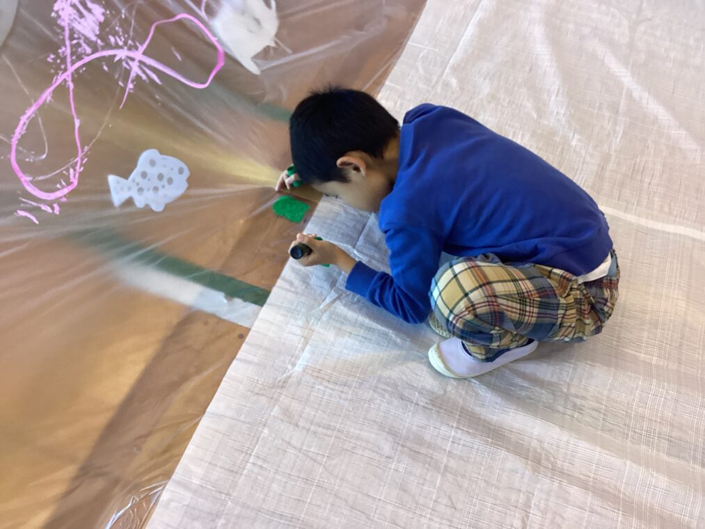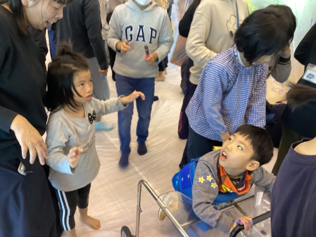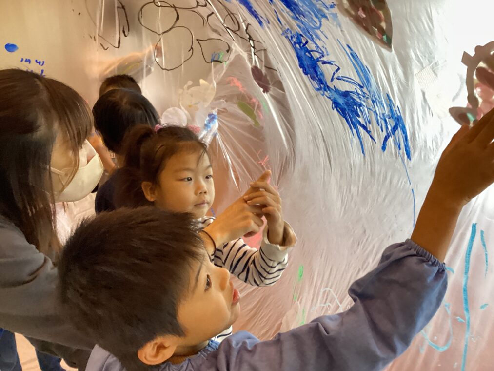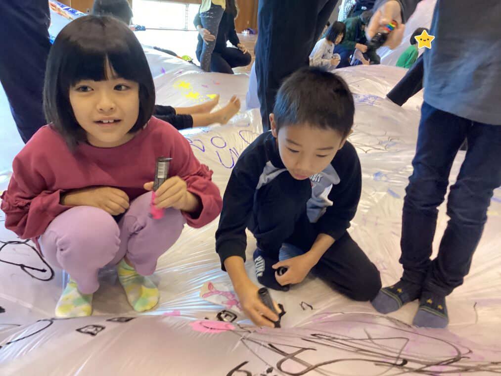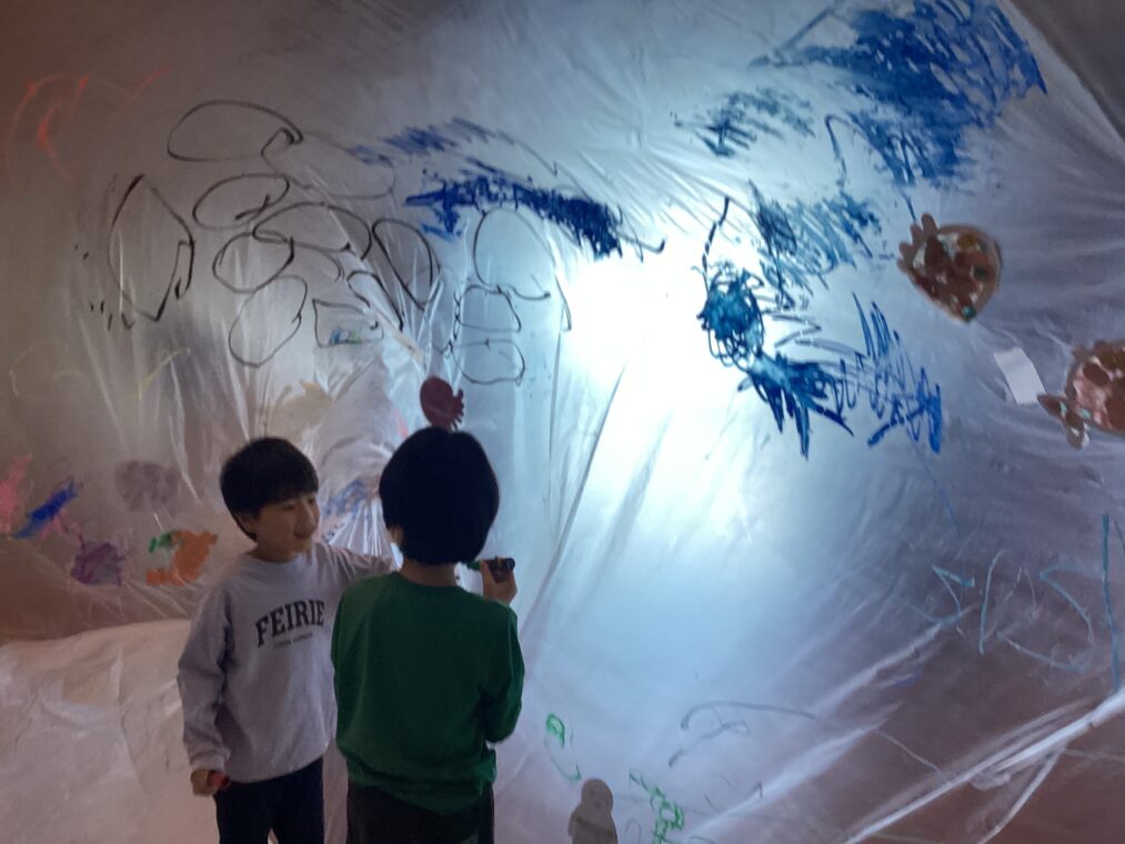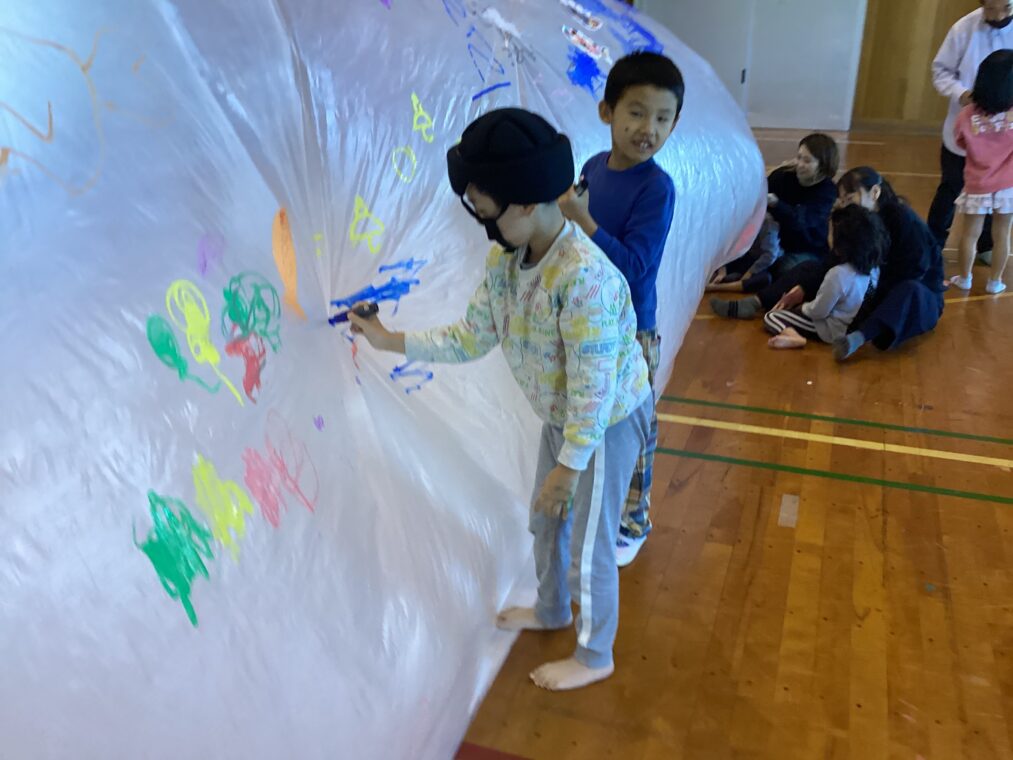 10月30日(木)に地域協働学習「文化の心次世代継承事業」(学校・アート・出会いプロジェクト)の一環として、池坊短期大学 幼児保育学科教授 岩野勝人様を講師に迎え、「巨大ドームで水族館」づくりに取り組みました。ナイロンでできたドームにみんなで魚の絵を描いたり、貼ったりした後、扇風機で風を送り込むと、どんどん膨らんでいくドームに子ども達は目を輝かせていました。ドームの中は壁や天井いっぱいに魚が泳いでいるようで子ども達は大興奮でした。その後も魚を描き続けたり、鑑賞したりと巨大ドーム水族館を存分に楽しみました。