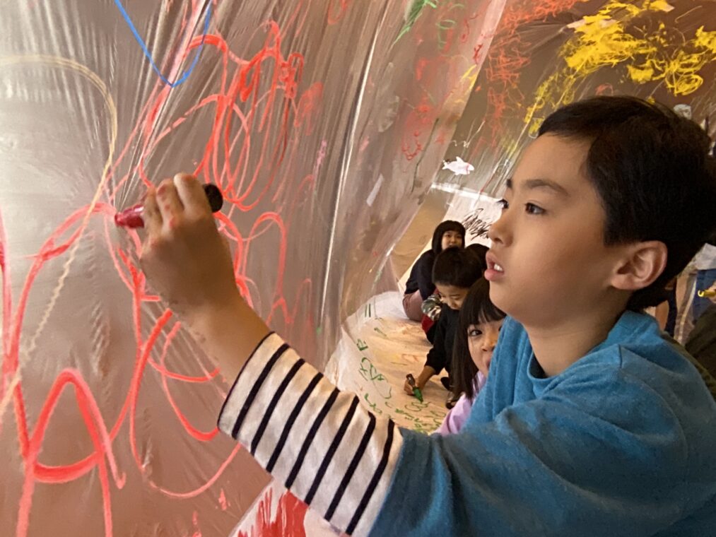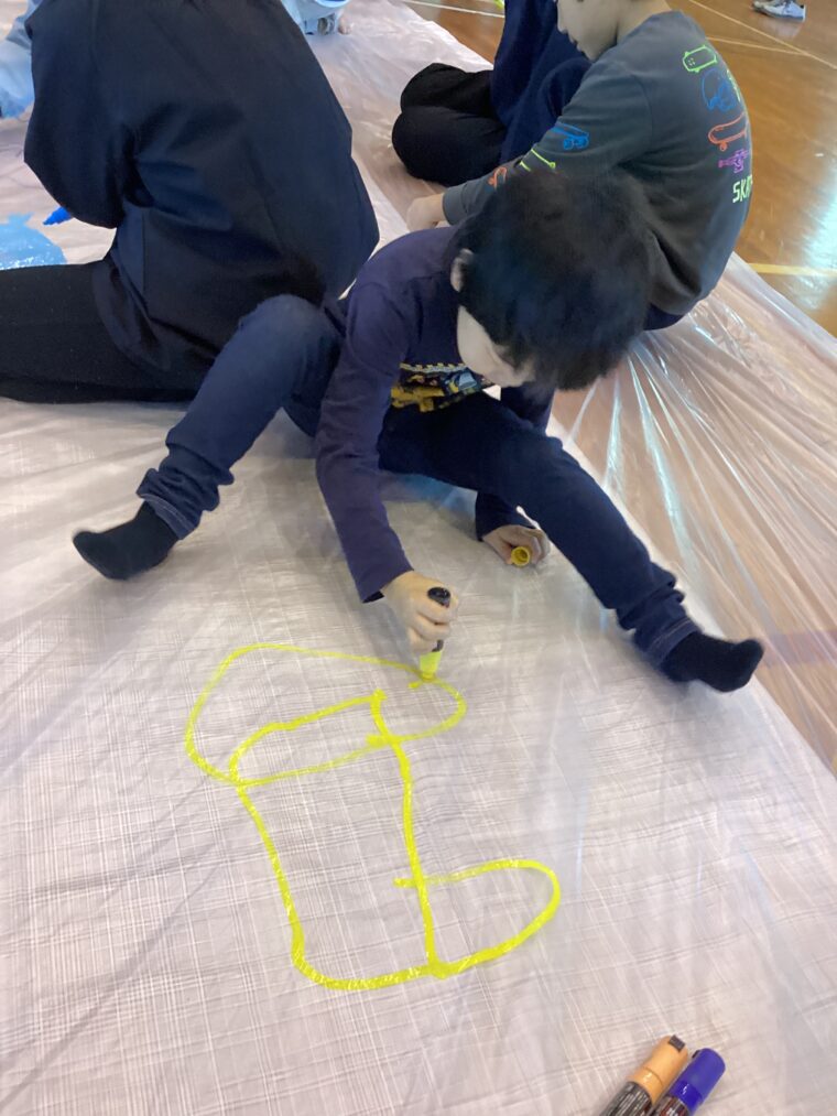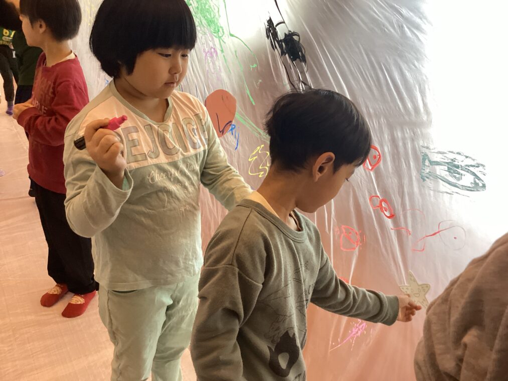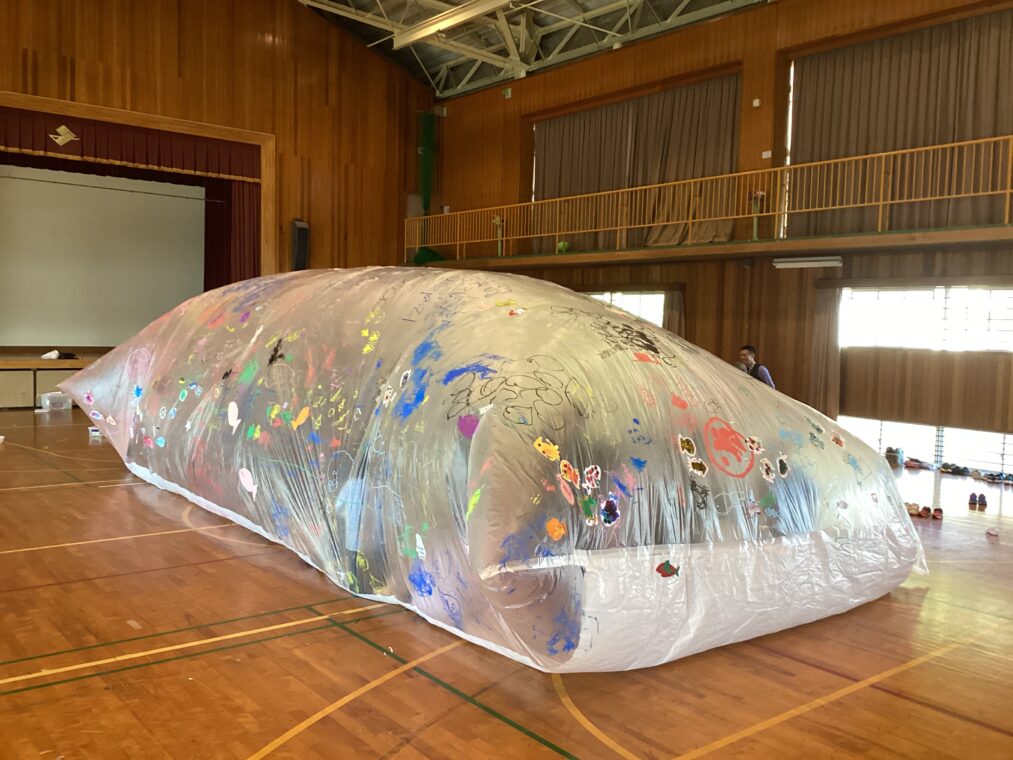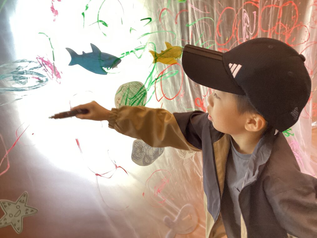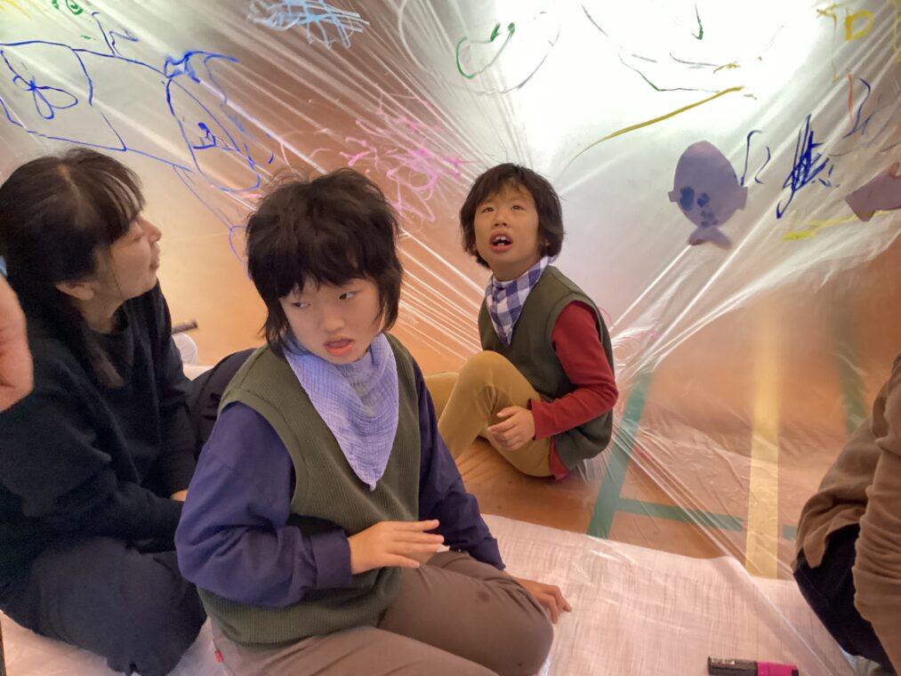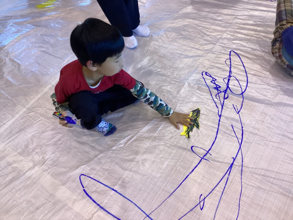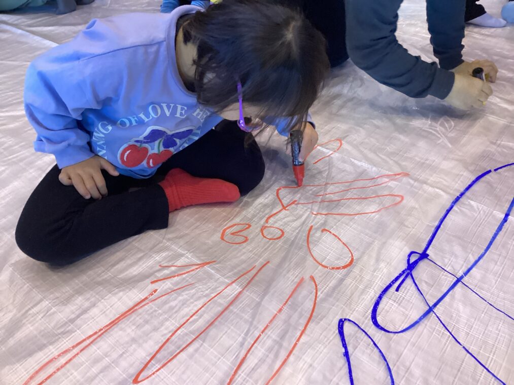 10月30日(木)に地域協働学習「文化の心次世代継承事業」(学校・アート・出会いプロジェクト)の一環として、池坊短期大学 幼児保育学科教授 岩野勝人様を講師に迎え、「巨大ドームで水族館」づくりに取り組みました。ナイロンでできたドームにみんなで魚の絵を描いたり、貼ったりした後、扇風機で風を送り込むと、どんどん膨らんでいくドームに子ども達は目を輝かせていました。ドームの中は壁や天井いっぱいに魚が泳いでいるようで子ども達は大興奮でした。その後も魚を描き続けたり、鑑賞したりと巨大ドーム水族館を存分に楽しみました。