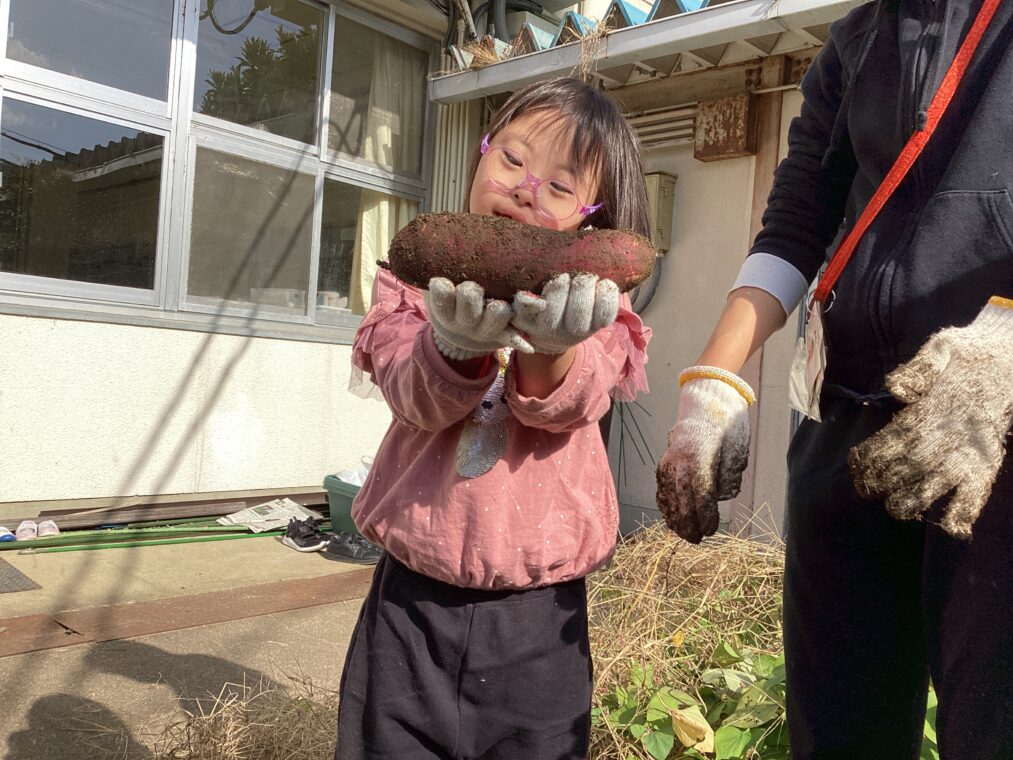 | 生活単元学習「やってみたいむ」では、6月に植えて栽培していたさつまいもを収穫しました。「大きくなっているかな。」「たくさんとれるかな。」とドキドキしながら、夢中で掘っていくと…大きなさつまいもがたくさん収穫できました。 |
