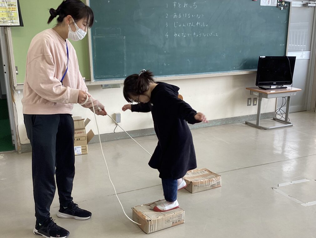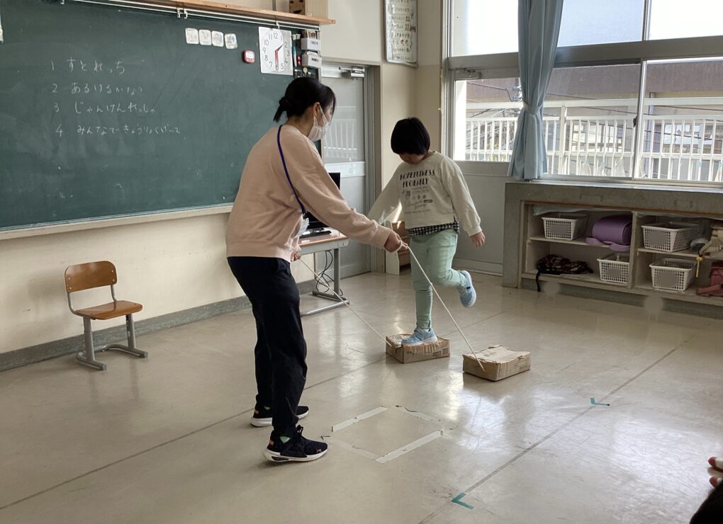 | 忍者の特訓遊びとして、2つの段ボールに片足ずつ乗せて進むミッションにチャレンジ!足場が動く中でもバランスを上手に取りながら慎重に進むことができました。もう1つのミッションとして「じゃんけん列車」をしました。指導者対子ども達で取り組み、結果は子ども達が負けてしまいましたが、「次は勝つ!」とみんなで話し合う姿がありました。 |