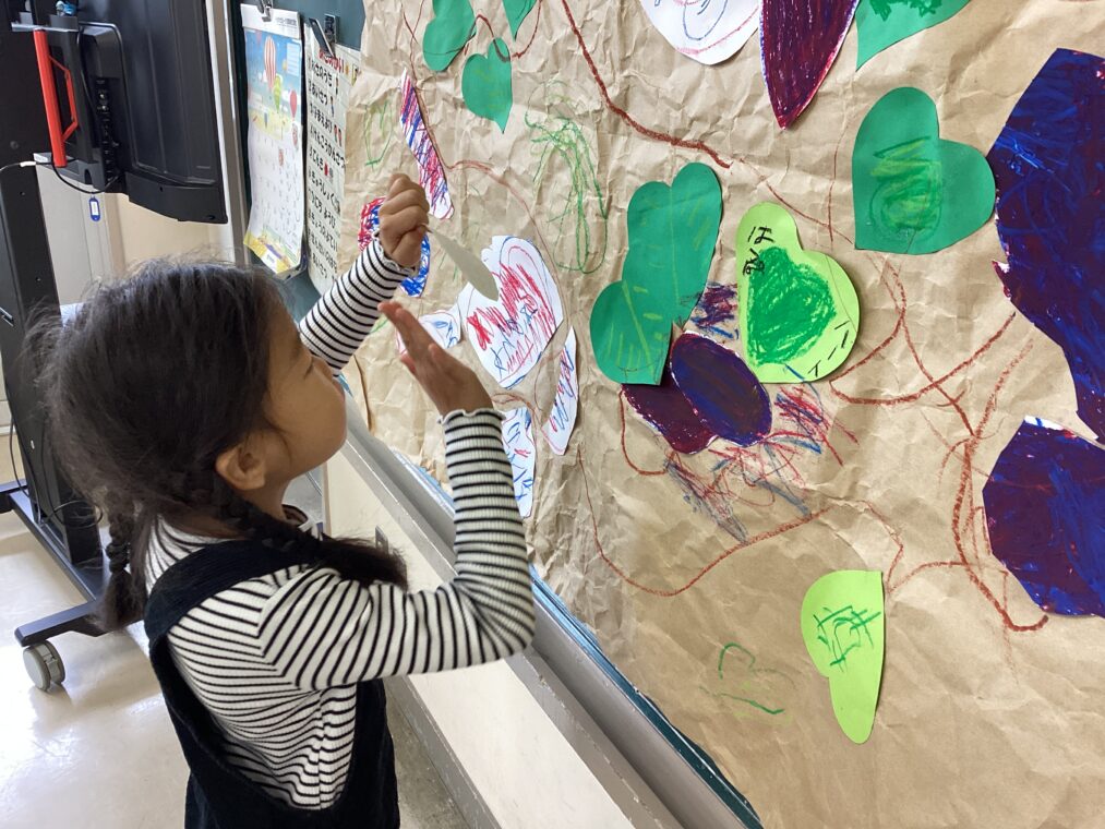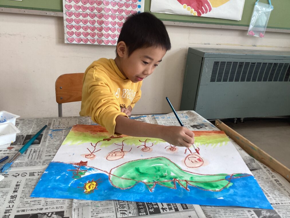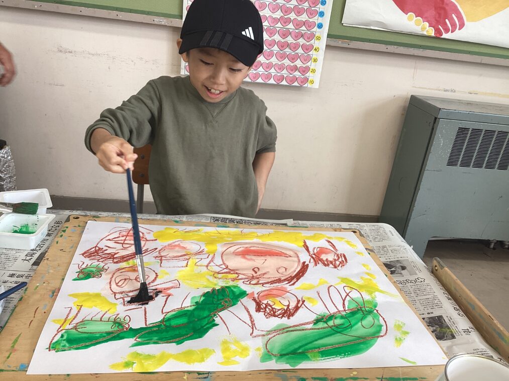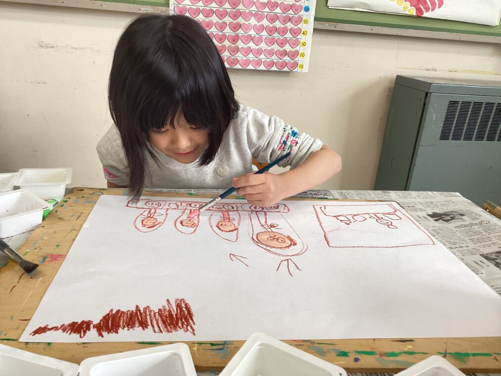| 大好きな家族の絵を描きました。家族とご飯を食べているところ、虫とりをしているところ、お出かけをしているところ…それぞれ好きな場面を決め、大きな紙に元気いっぱい描き、大好きがいっぱい詰まった絵が描けました。 |