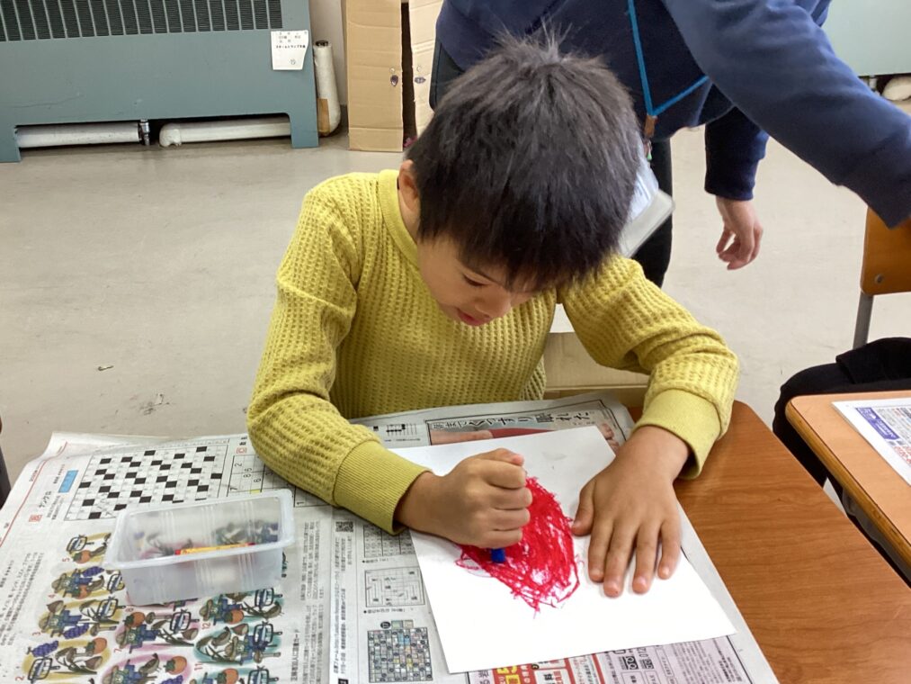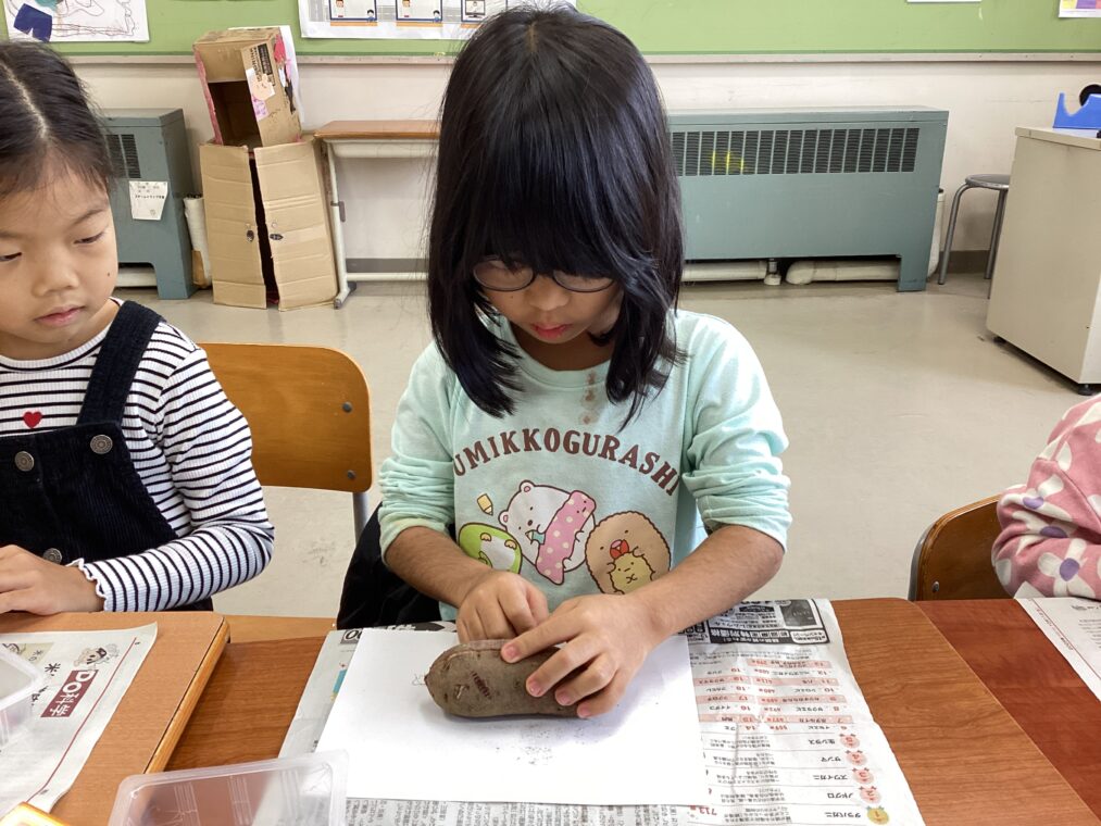 | 先週収穫したさつまいもの絵を描き、みんなで5組のさつまいも畑を完成させました。実際のさつまいもを使って大きさを確認しながら形を描き、その中を赤と青のクレヨンで塗っていきます。「できた!」と嬉しそうな表情がたくさん見られました。 |