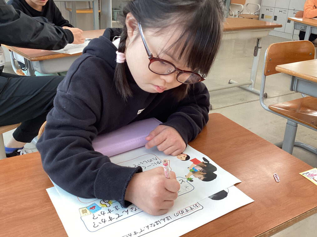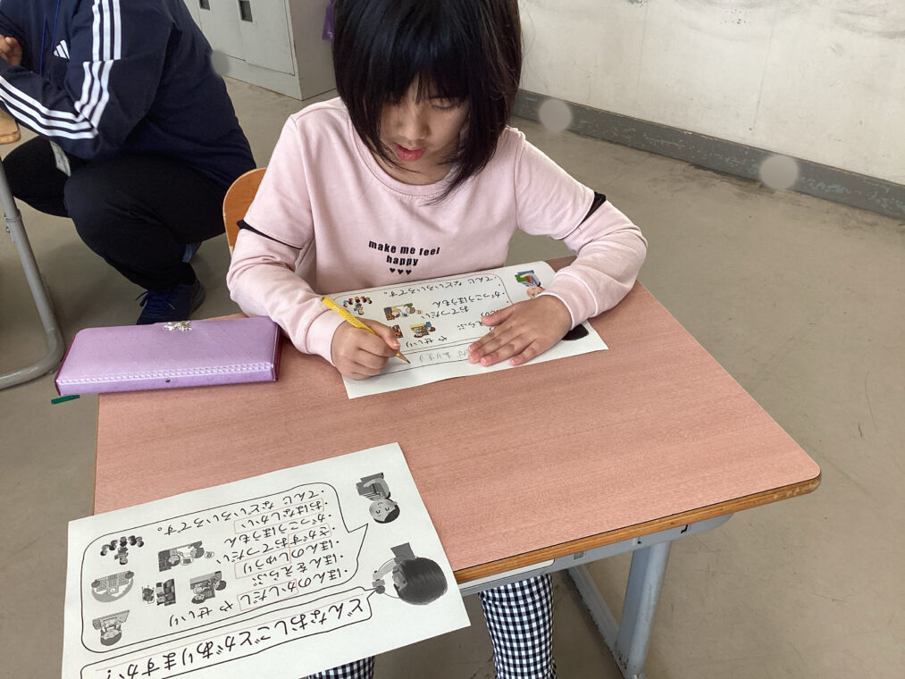 | 生活単元学習「やってみたいむ」では、校外学習の事後学習で、図書館司書さんへのインタビューをポスターにまとめました。質問内容や司書さんの回答内容を、手本を見ながら丁寧に写し書きしたり、ひらがなシールを貼ったり、イラストを貼ったりして完成させることができました。 |