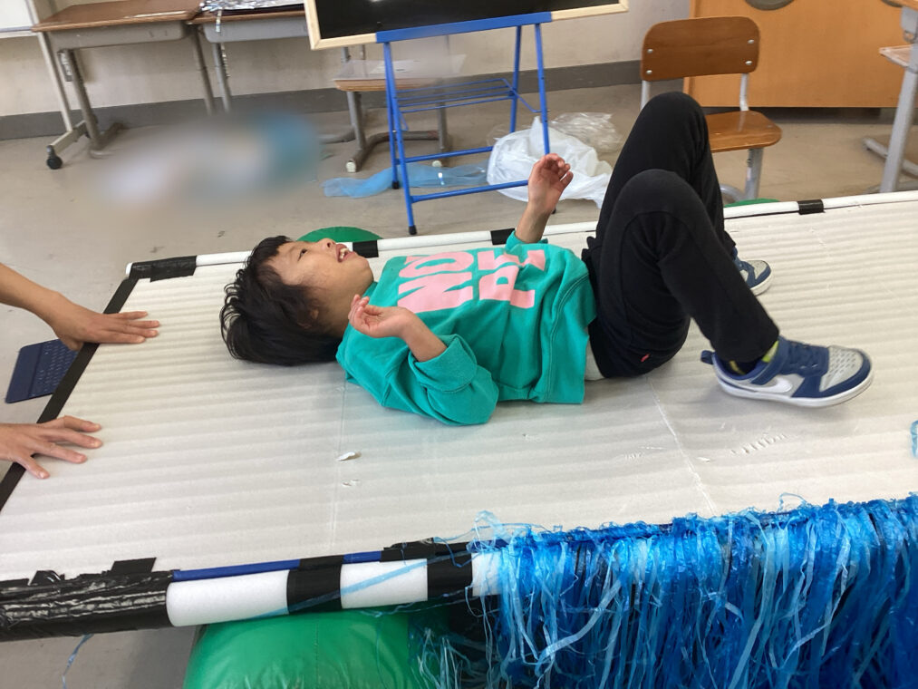 | クラス遊びの時間に「海の底探検」をしました。ライトでヒトデを光らせたり、揺れるイソギンチャクと踊ったり「海の底」の探検を楽しんだ後、最後は船に乗って無事、陸に戻ってきました。 |