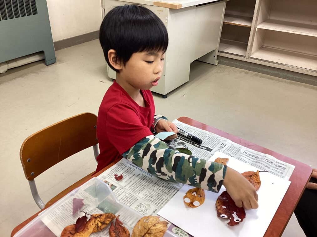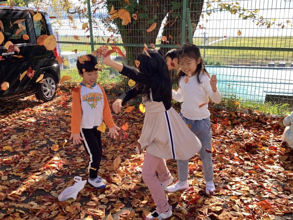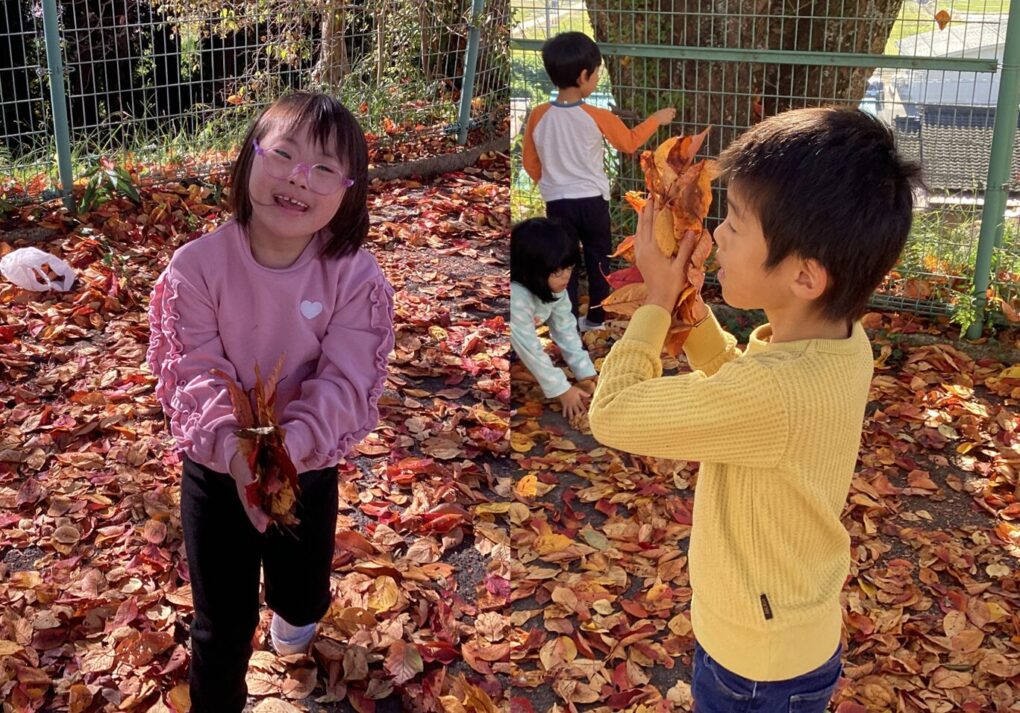 | 学校の落ち葉探しに出発!「いっぱいあるよ!」と集めたり、「いち、に、の、さん!」と落ち葉シャワーを楽しんだりしました。自分達で拾った落ち葉を使って、落ち葉おばけ作りにも挑戦。それぞれの個性溢れるすてきな作品ができあがりました。 |