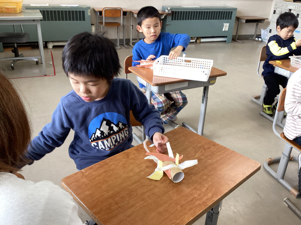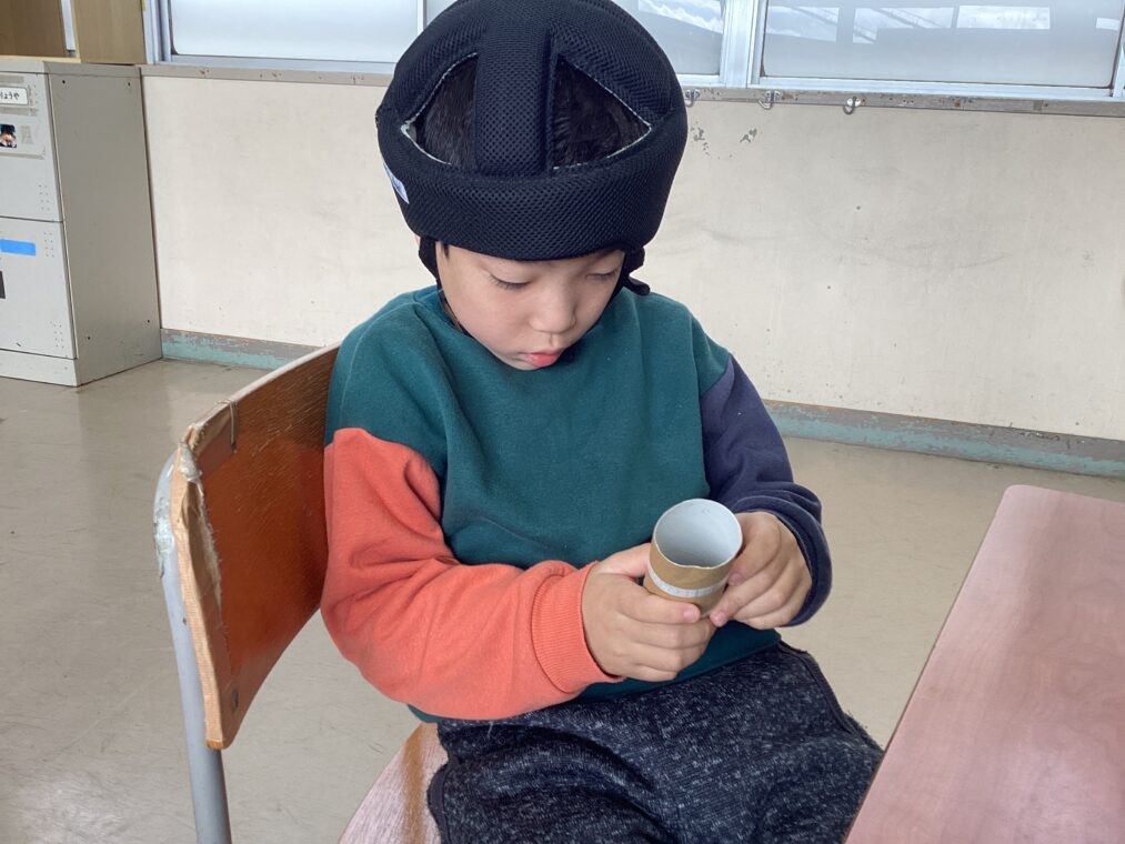 | トイレットペーパーの芯に折り紙を貼り付け、かわいい「みのむし」を作りました。たくさん貼り付けた後は、目を付けて完成。秋らしい作品が出来上がりました。 |