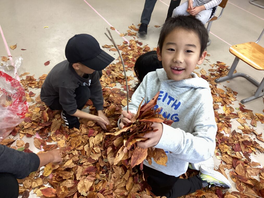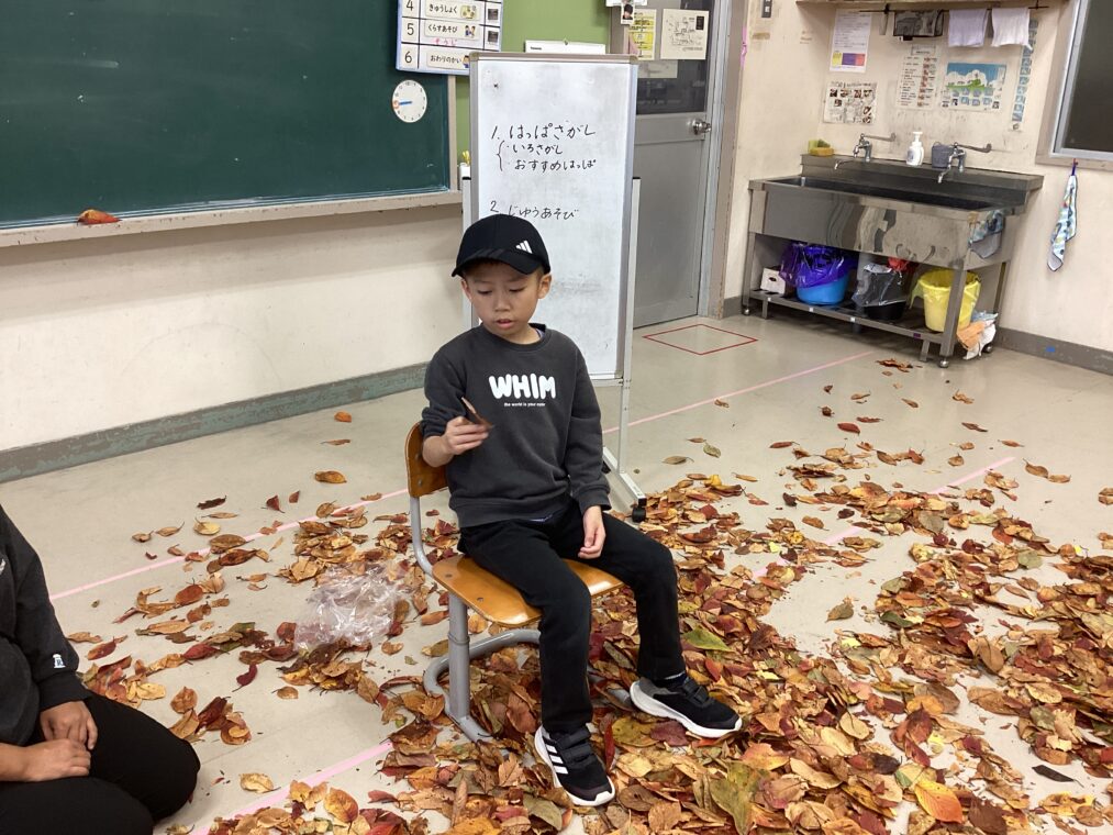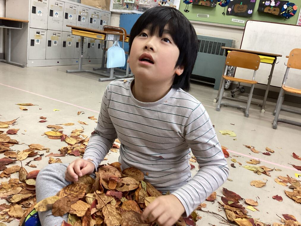 | 落ち葉拾いに行き、カサカサという音に秋を感じました。また、教室内で落ち葉の感触を存分に味わいながら、色や大きさの違う葉っぱを見つけたり、お気に入りの葉っぱを友達と見せ合いっこしたりして楽しみました。 |
