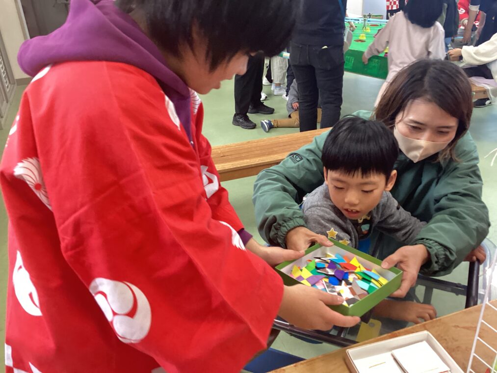 | YOSAフェスティバルの学部リハーサルで、小学部10組のなかよしまつりに参加してきました。店員役の10組の友達に声を掛けてもらいながら、それぞれの遊びコーナーを楽しみました。 |