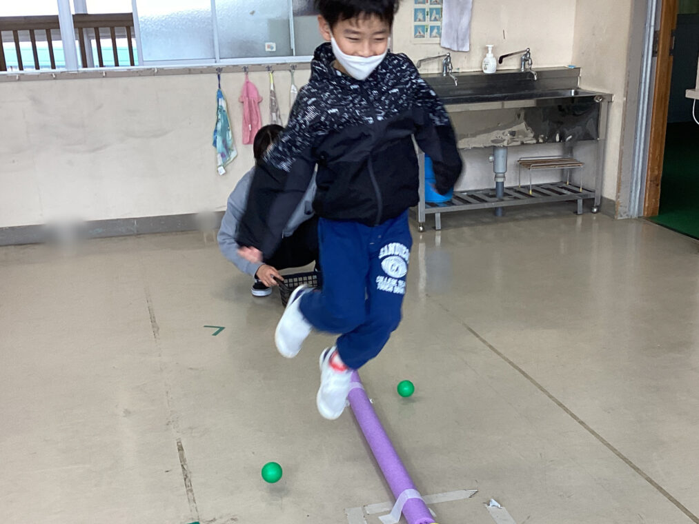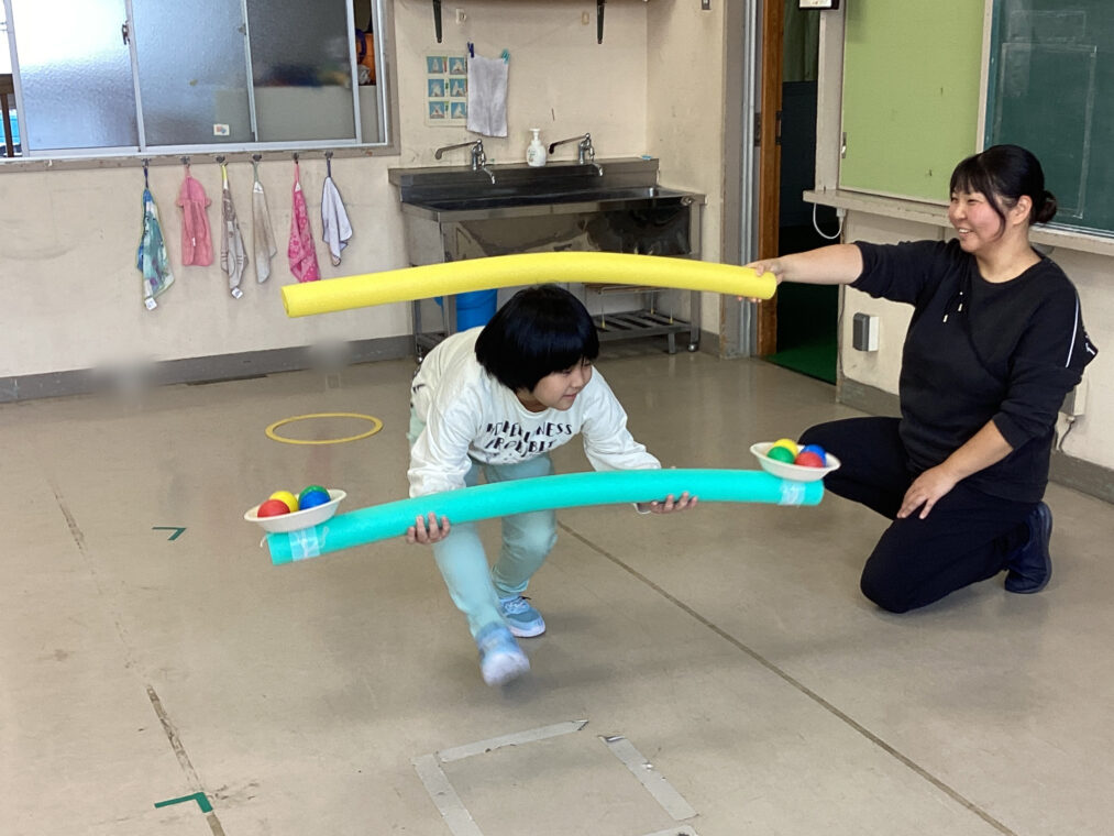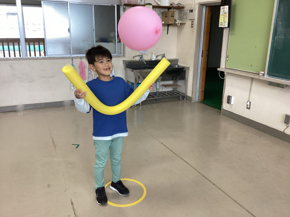 | クラス遊びで、プールスティックを使った遊びに取り組みました。飛んでくる風船をキャッチしたり、転がるボールをジャンプで避けたり、両サイドのボールが落ちないようバランスをとって進んだり、体をたくさん動かして遊ぶことができました。 |