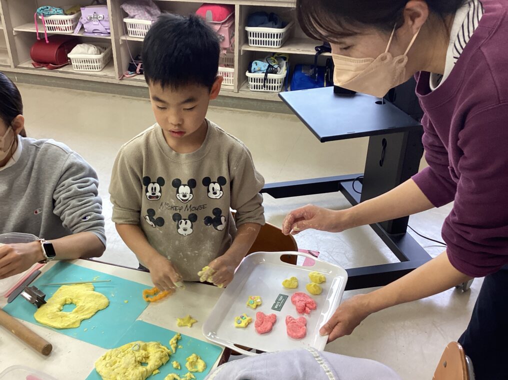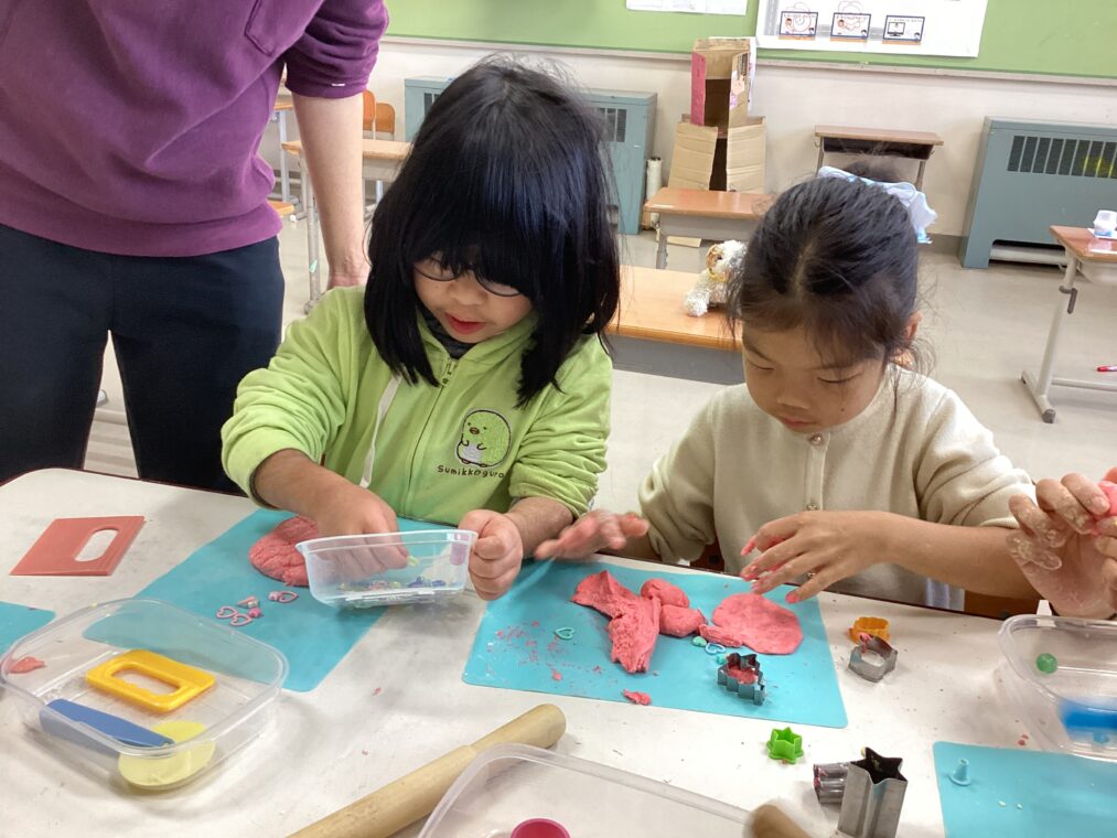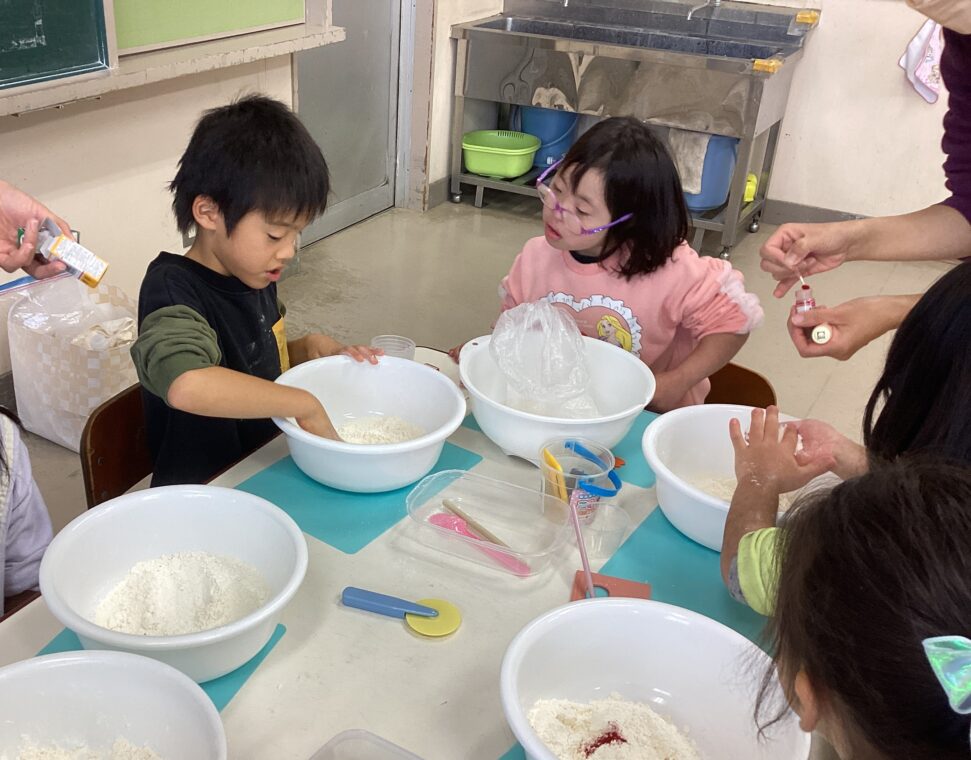 | 水を加えることで、さらさらの小麦粉がもちもちの小麦粉粘土に変わっていく工程を、楽しみながらこねこねしていく子ども達。できあがった小麦粉粘土をクッキーに見立てて、麺棒で伸ばしたり、色々な形を作ったり、型抜きを使ったりしながら、イメージを膨らませて遊びました。 |