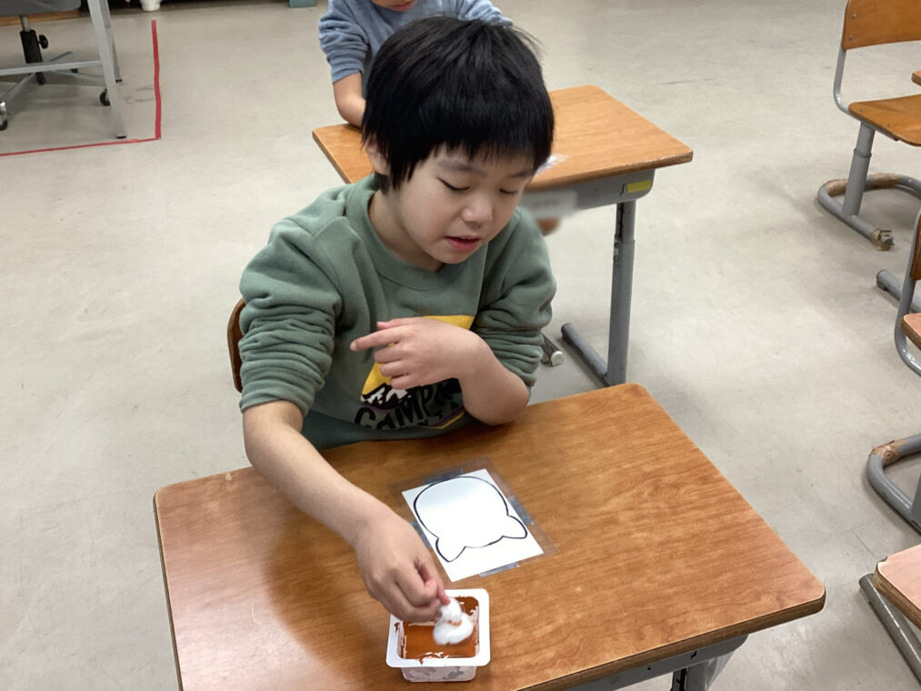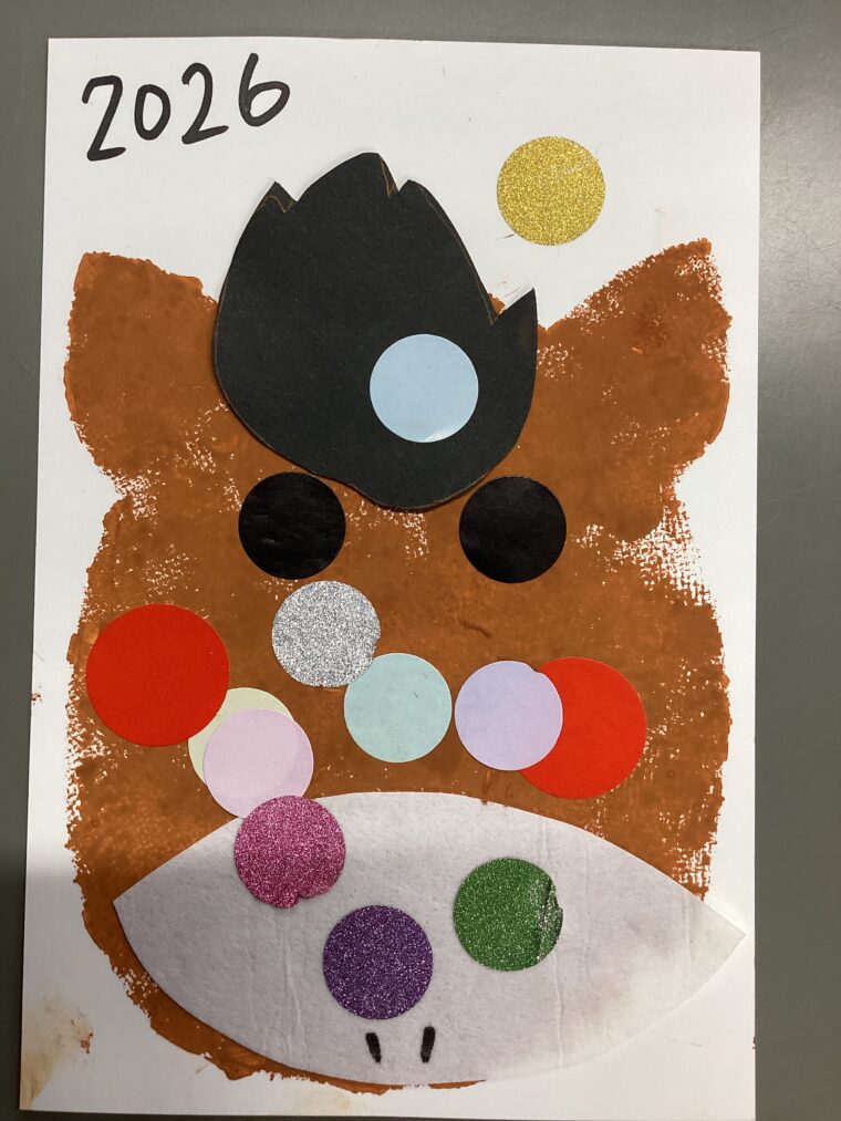 | 生活単元学習「やってみたいむ」では、「年賀状ってなに?」と題して年賀状はお正月に届くお手紙だということを学習してから、年賀状を作りました。来年の干支の馬にタンポで色をつけたり、目やほっぺをシールで貼ったりしました。「お手紙届くかな?」と、今から楽しみしています。 |