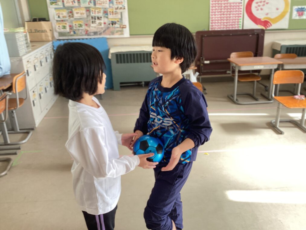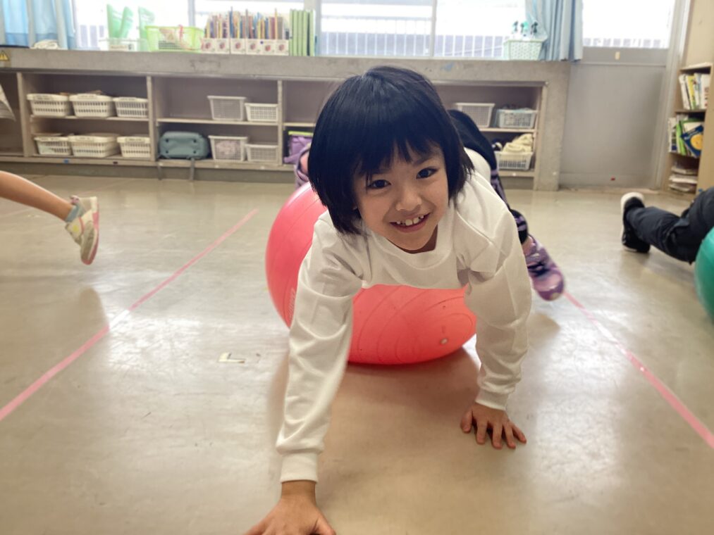 | バランスボールの上に座ってぴょんぴょん跳ねたり、お腹の下にボールを置き四つ這いで前後に進んだりしました。ボールを足の間に挟んで跳んだり、友達に届けたりしながら、みんなで楽しくからだを動かしました。 |