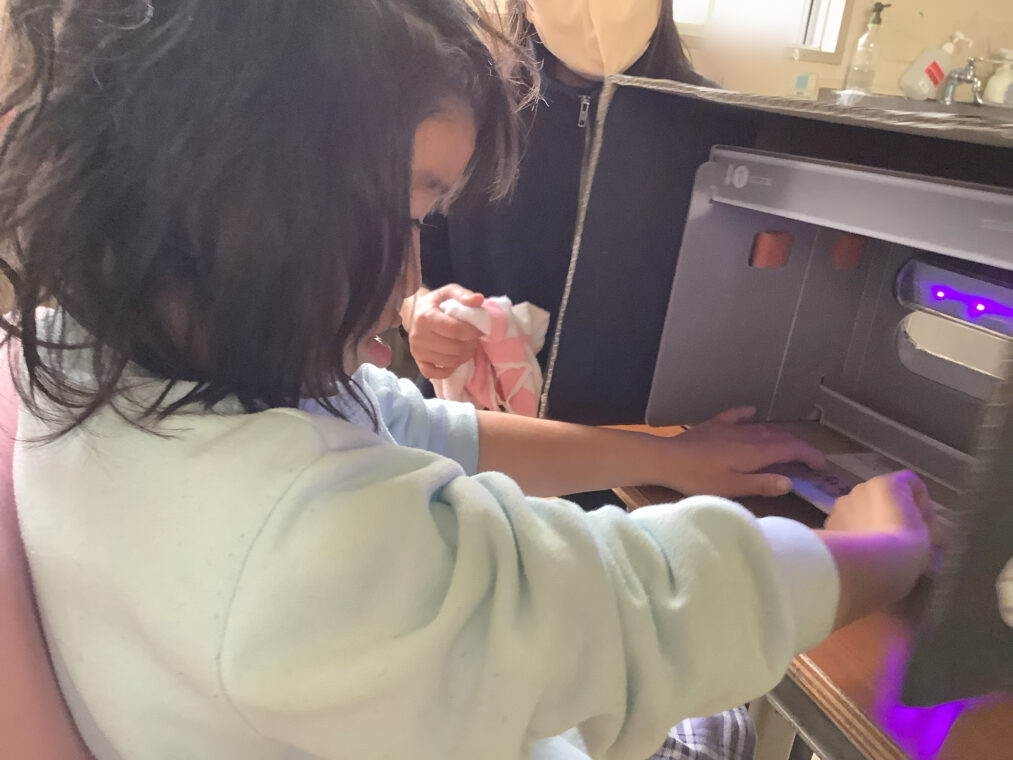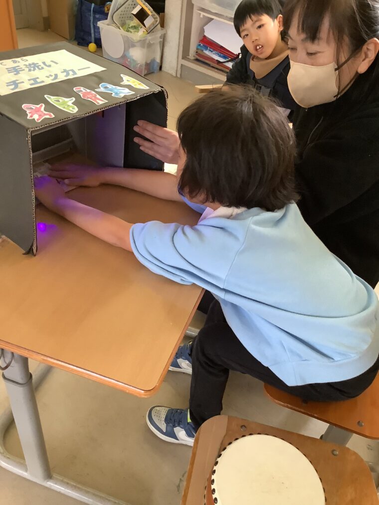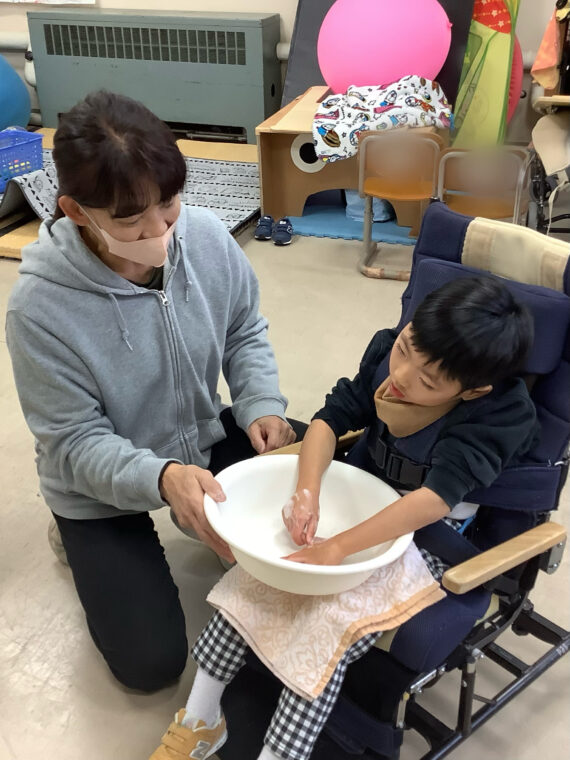 | 保健学習で手洗いの勉強をしました。いつ手洗いするのかや手順の話を聞いた後、歌に合わせてそれぞれ綺麗になるよう手洗いを頑張りました。リモートでつなぎ、学習室の友達ともお互いの様子を見ながら取り組みました。 |