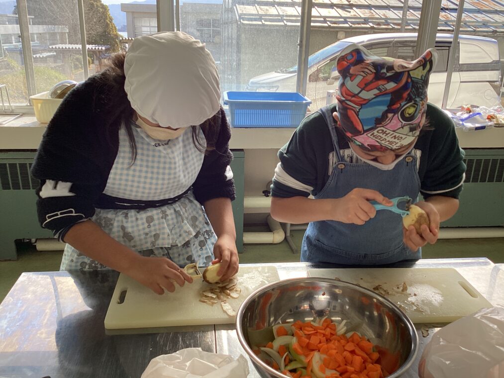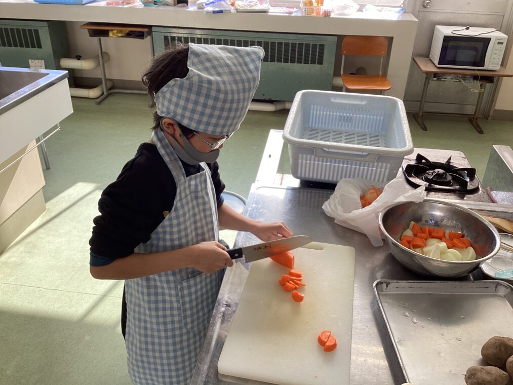 | 12月4日に校外学習でシチューの材料を購入し、今日はいざ調理!説明をよく聞いて、道具を安全に使いながら作っていきました。「いい匂いがしてきた!」「お腹へった!」と言いながら頑張って作ったシチューは格別!あっという間に完食でした。 |